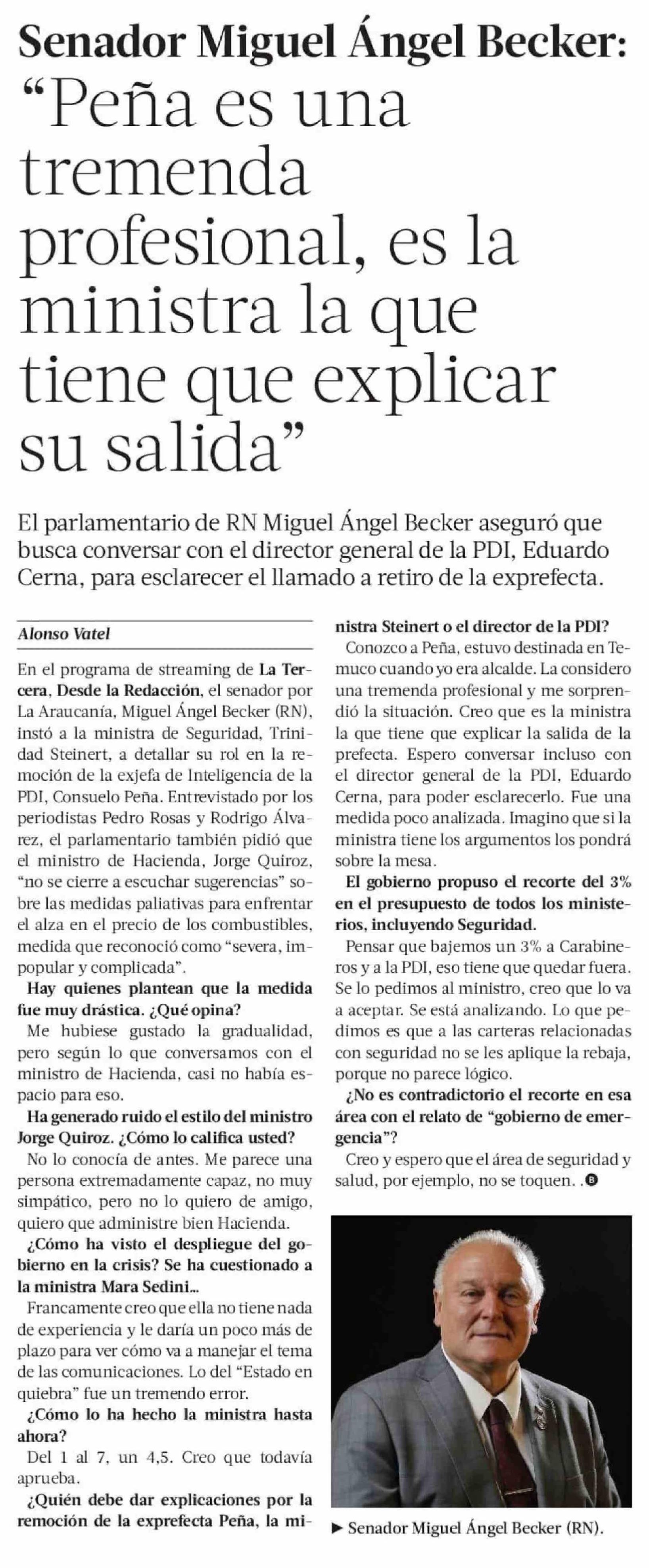 Senador Miguel Ángel Becker: "Peña es una tremenda profesional, es la ministra la que tiene que explicar su salida" 27-03-2026 La Tercera |