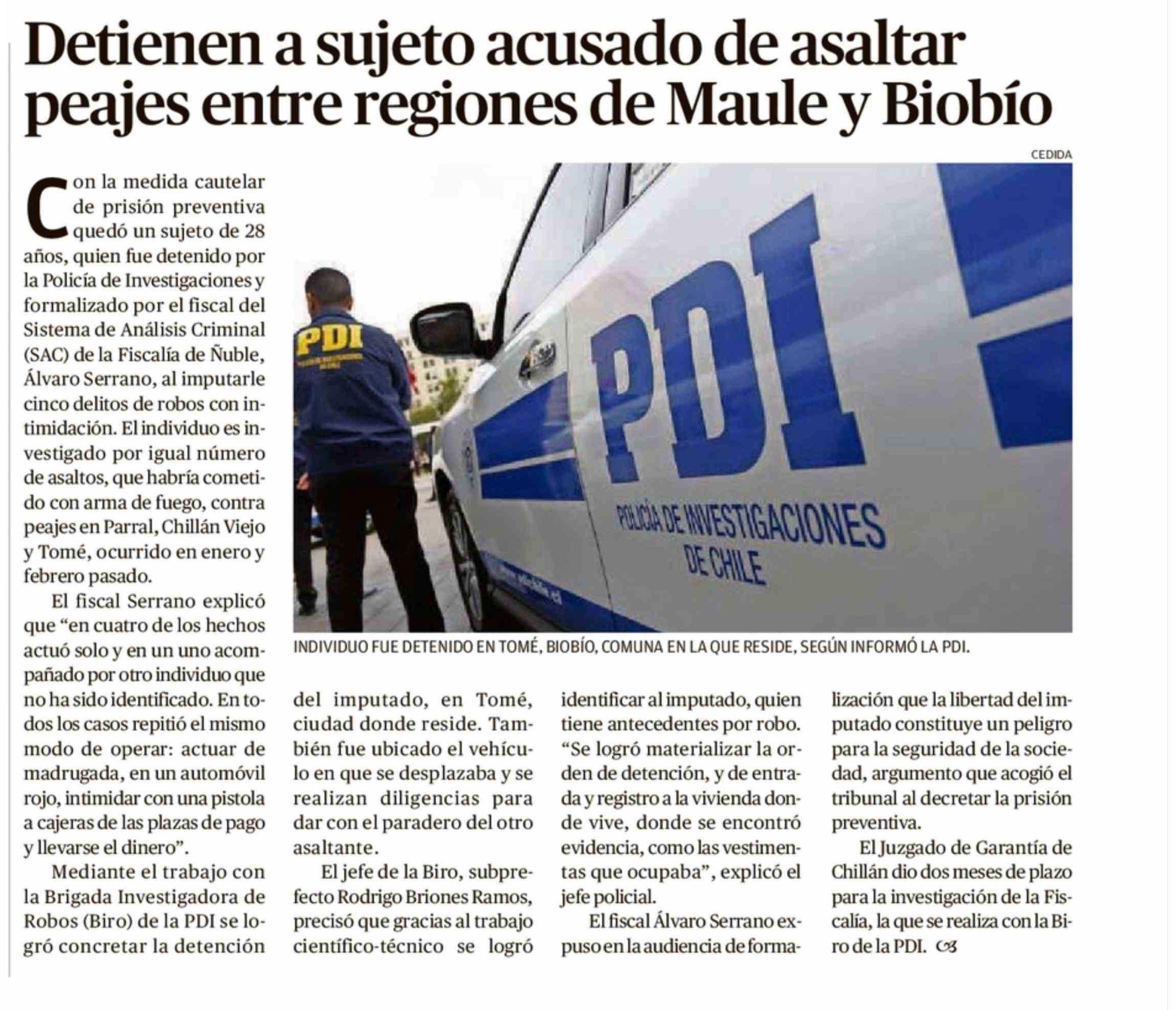 | Título: | Detienen a sujeto acusado de asaltar peajes entre regiones de Maule y Biobío |