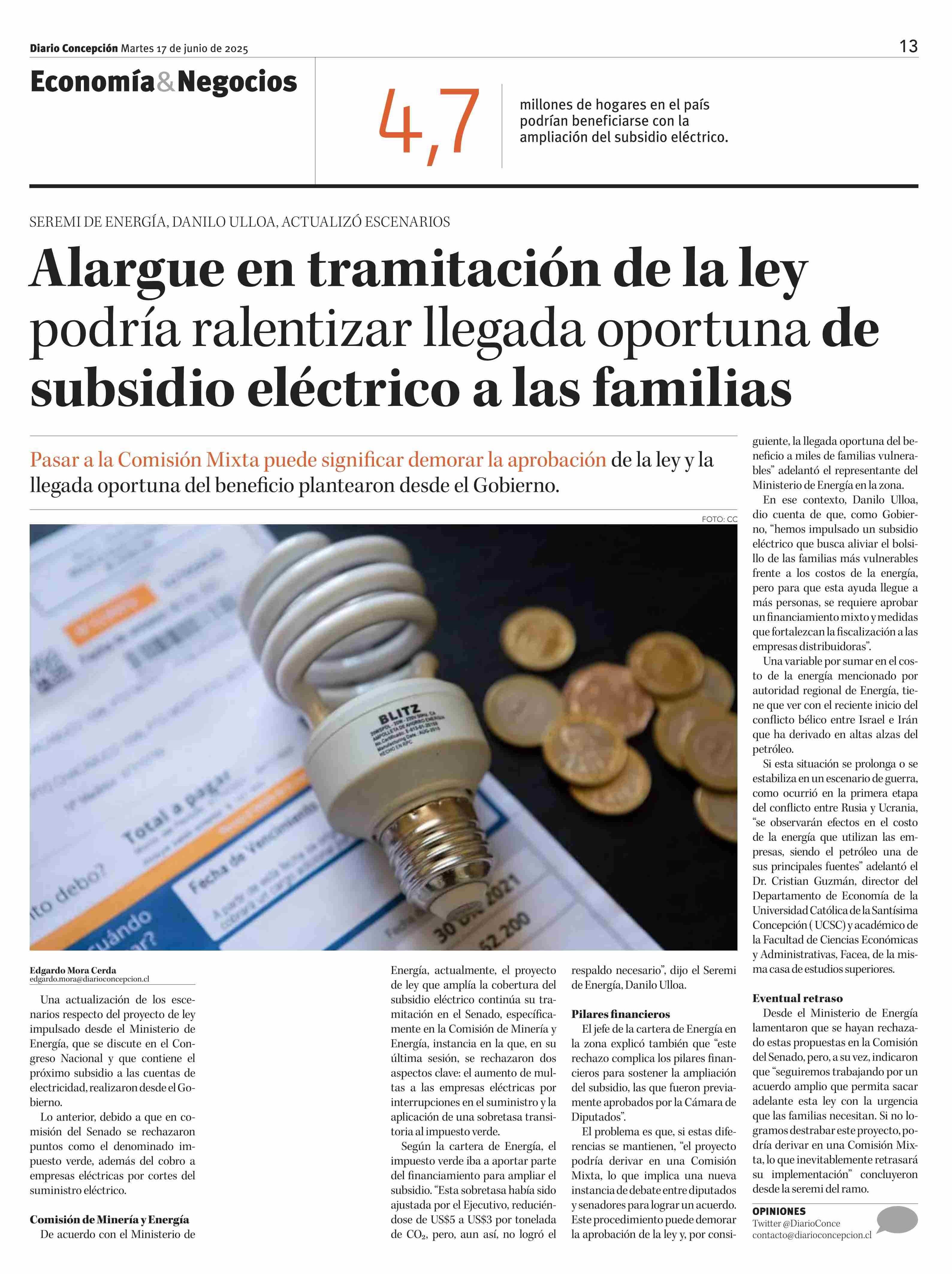 Alargue en tramitación de la ley podría ralentizar llegada oportuna de subsidio eléctrico a las familias 17-06-2025 Diario Concepción |