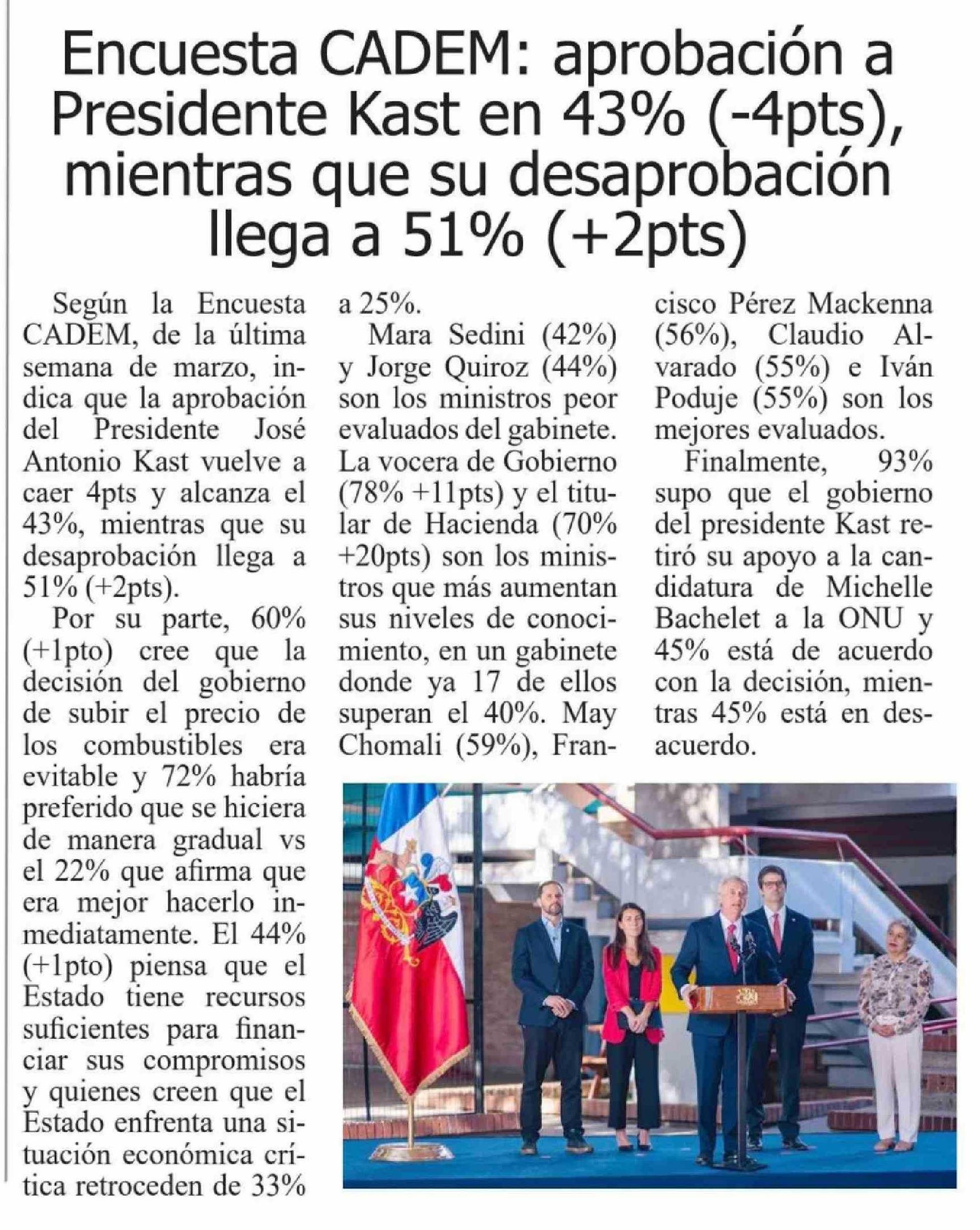 Encuesta CADEM: aprobación a Presidente Kast en 43% (-4pts), mientras que su desaprobación llega a 51% (+2pts) 31-03-2026 El Heraldo |