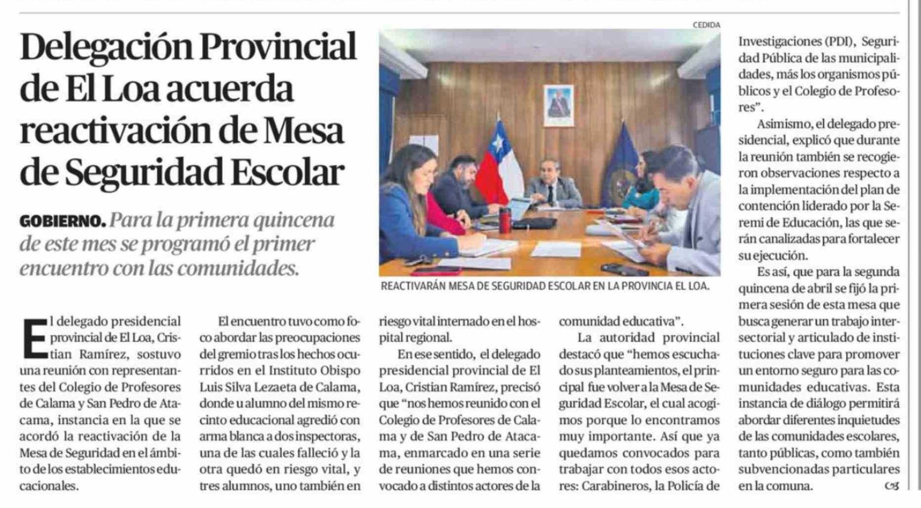 Delegación Provincial de El Loa acuerda reactivación de Mesa de Seguridad Escolar 02-04-2026 El Mercurio de Calama |