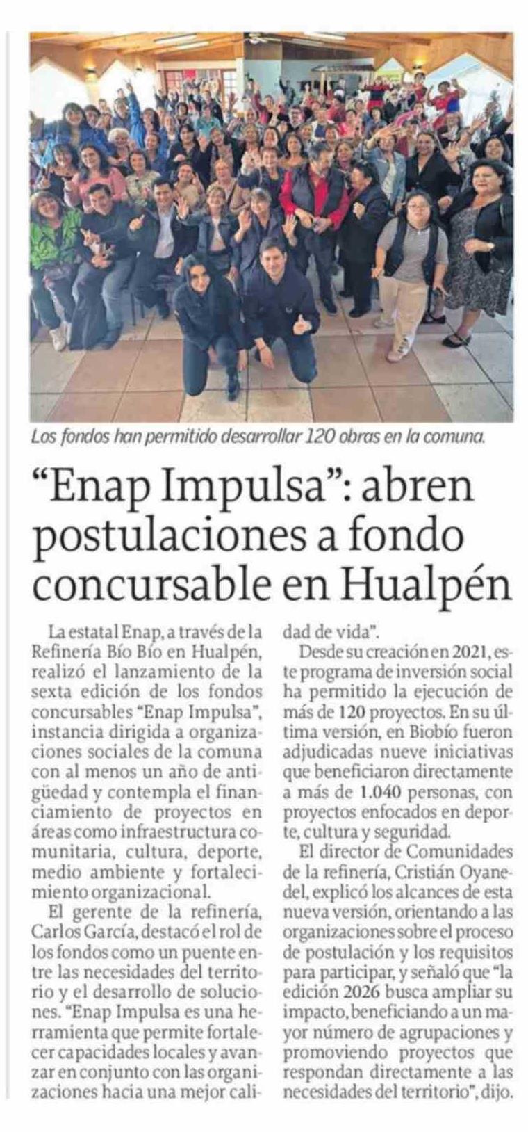 "Enap Impulsa": abren postulaciones a fondo concursable en Hualpén 31-03-2026 El Sur |