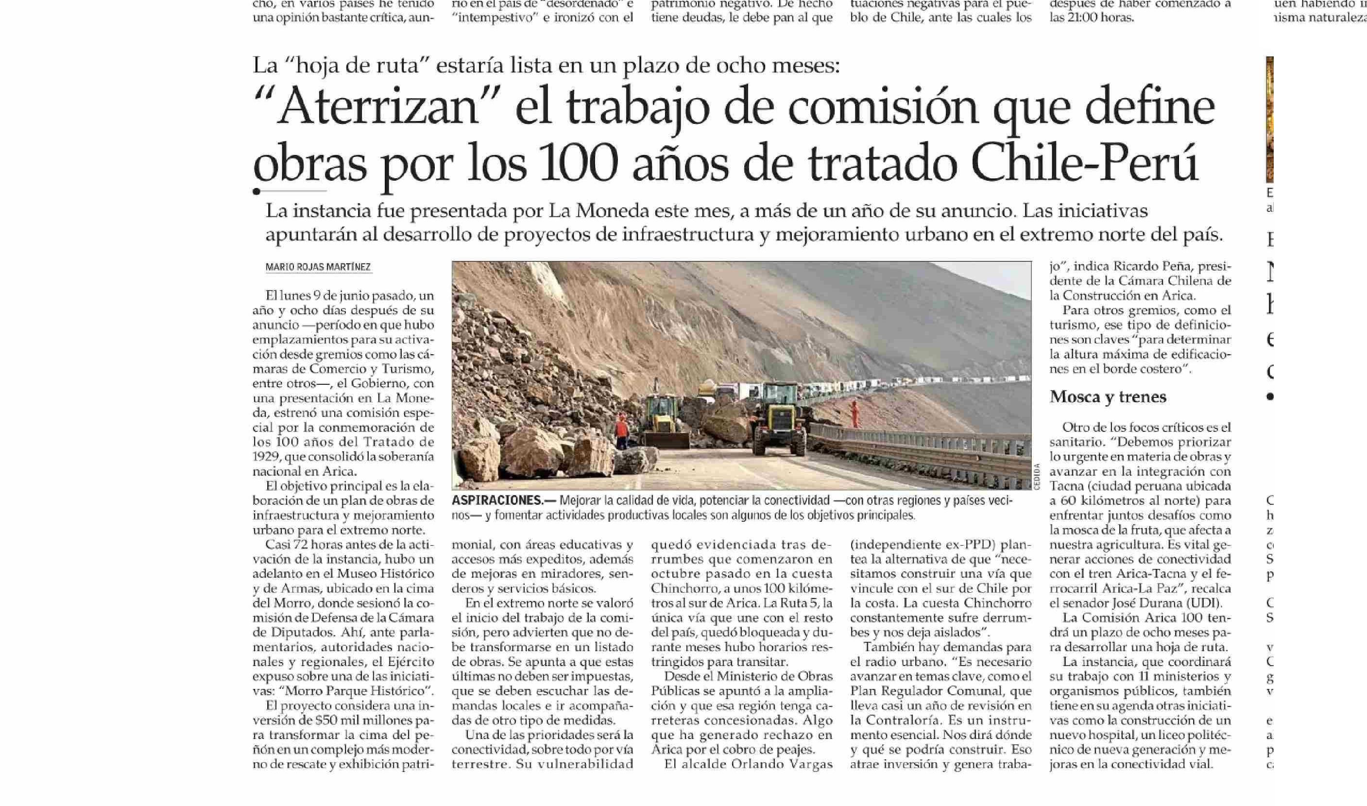 “Aterrizan” el trabajo de comisión que define obras por los 100 años de tratado Chile-Perú 23-06-2025 El Mercurio |