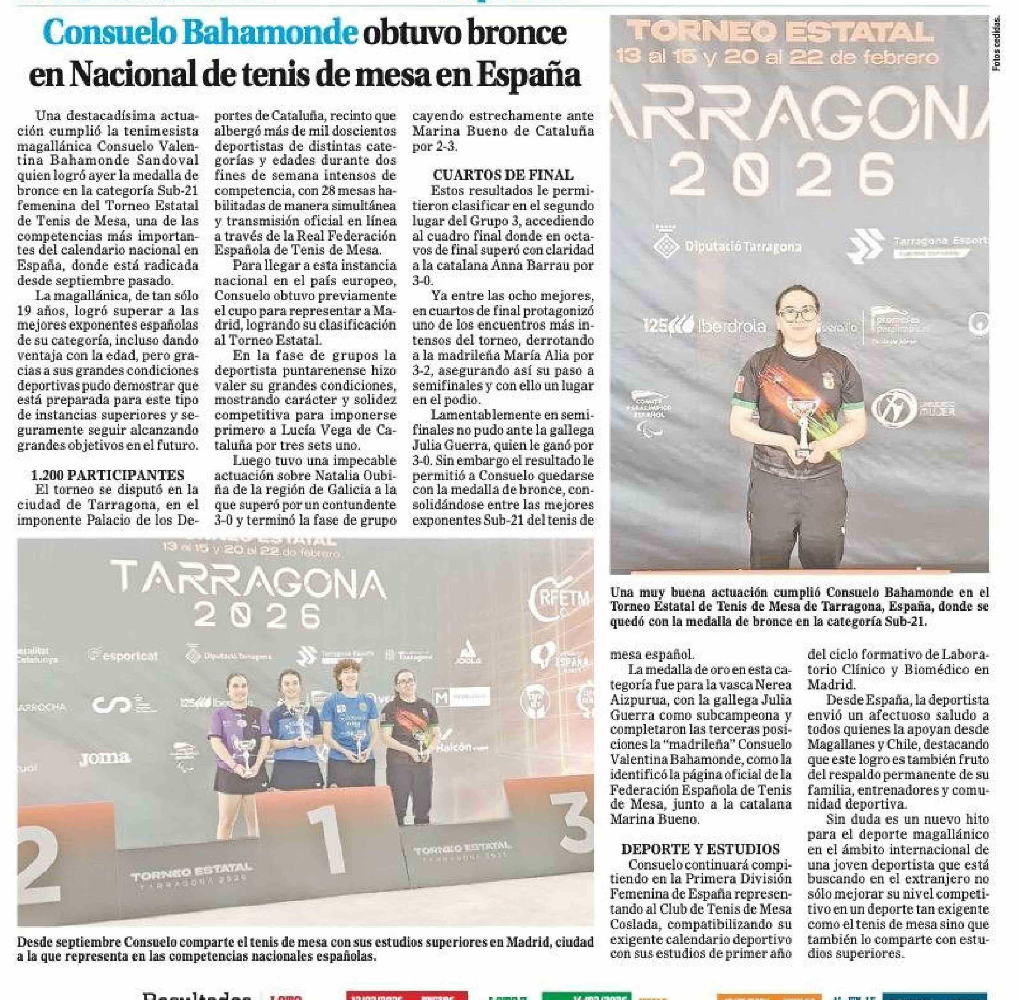 Consuelo Bahamonde obtuvo bronce en Nacional de tenis de mesa en España 15-02-2026 El Magallanes |