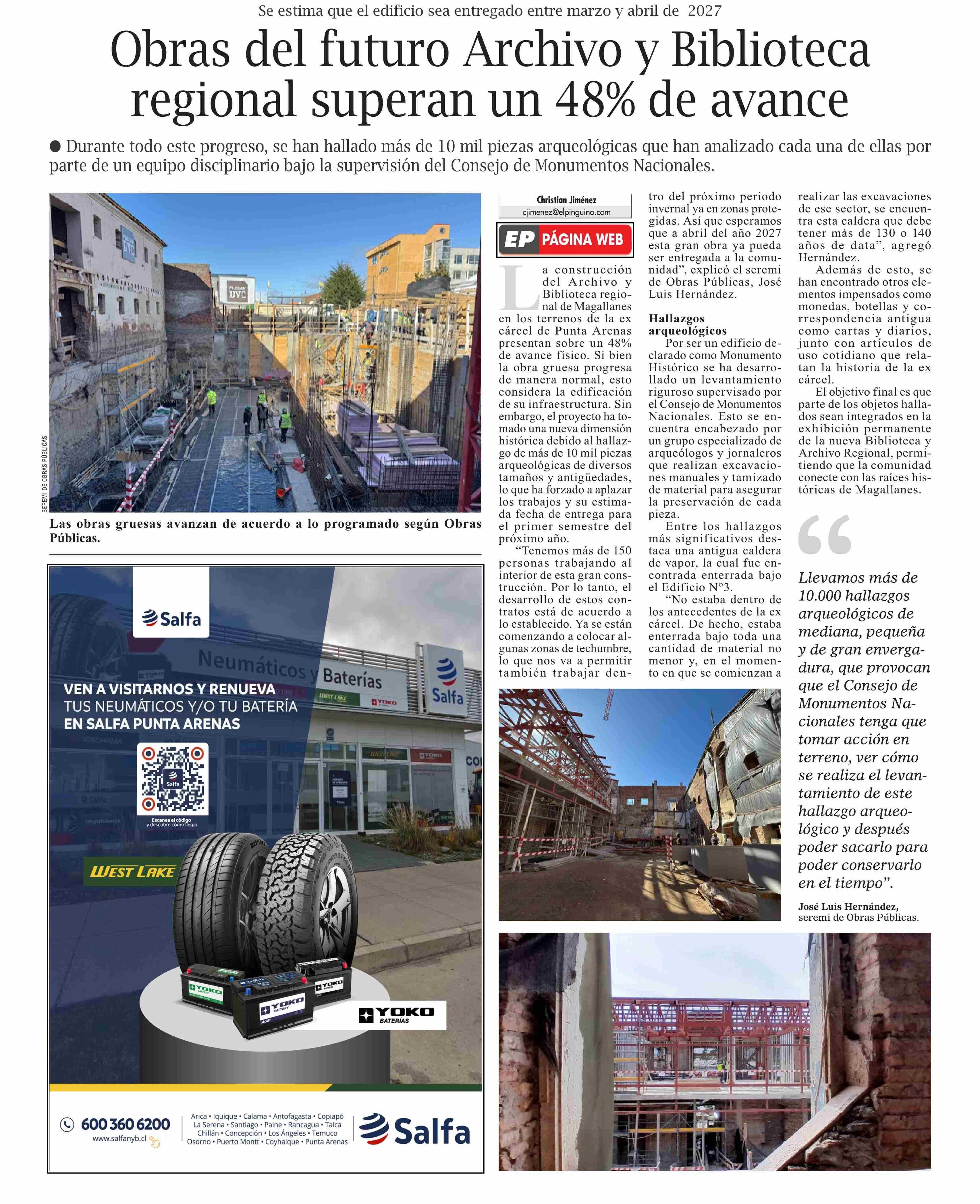 Obras del futuro Archivo y Biblioteca regional superan un 48% de avance 09-02-2026 El Pingüino |