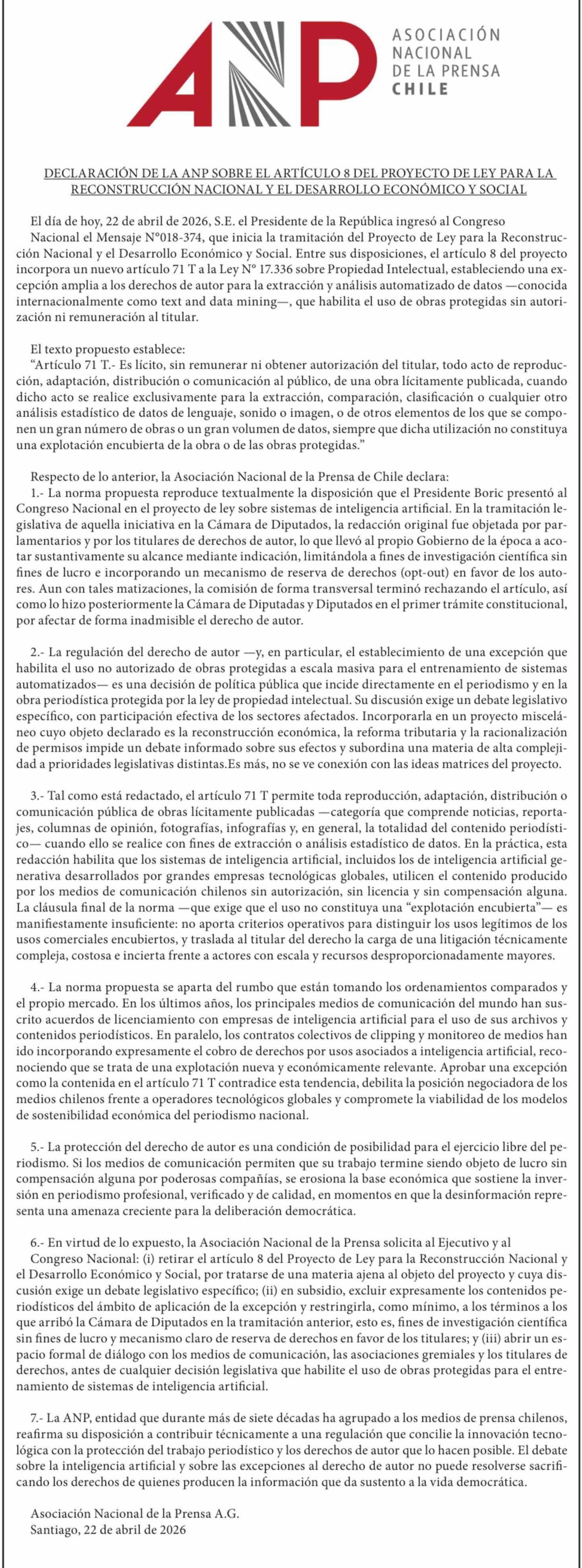 | Título: | ASOCIACIÓN NACIONAL DE LA PRENSA CHILE |