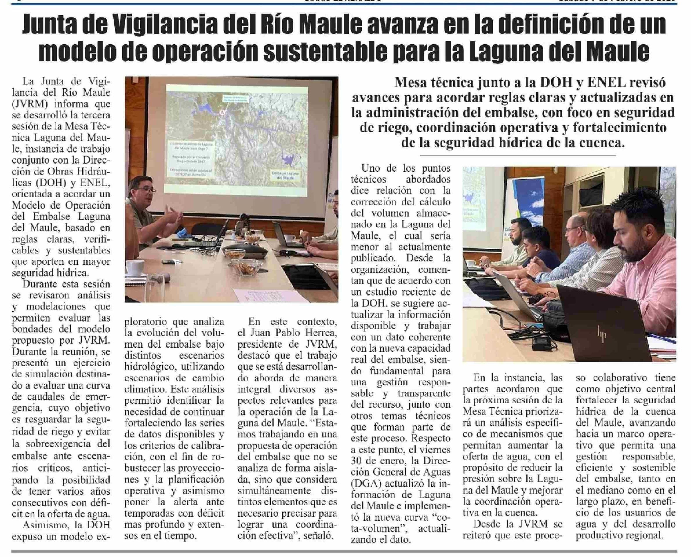 Junta de Vigilancia del Río Maule avanza en la definición de un modelo de operación sustentable para la Laguna del Maule 07-02-2026 El Heraldo |