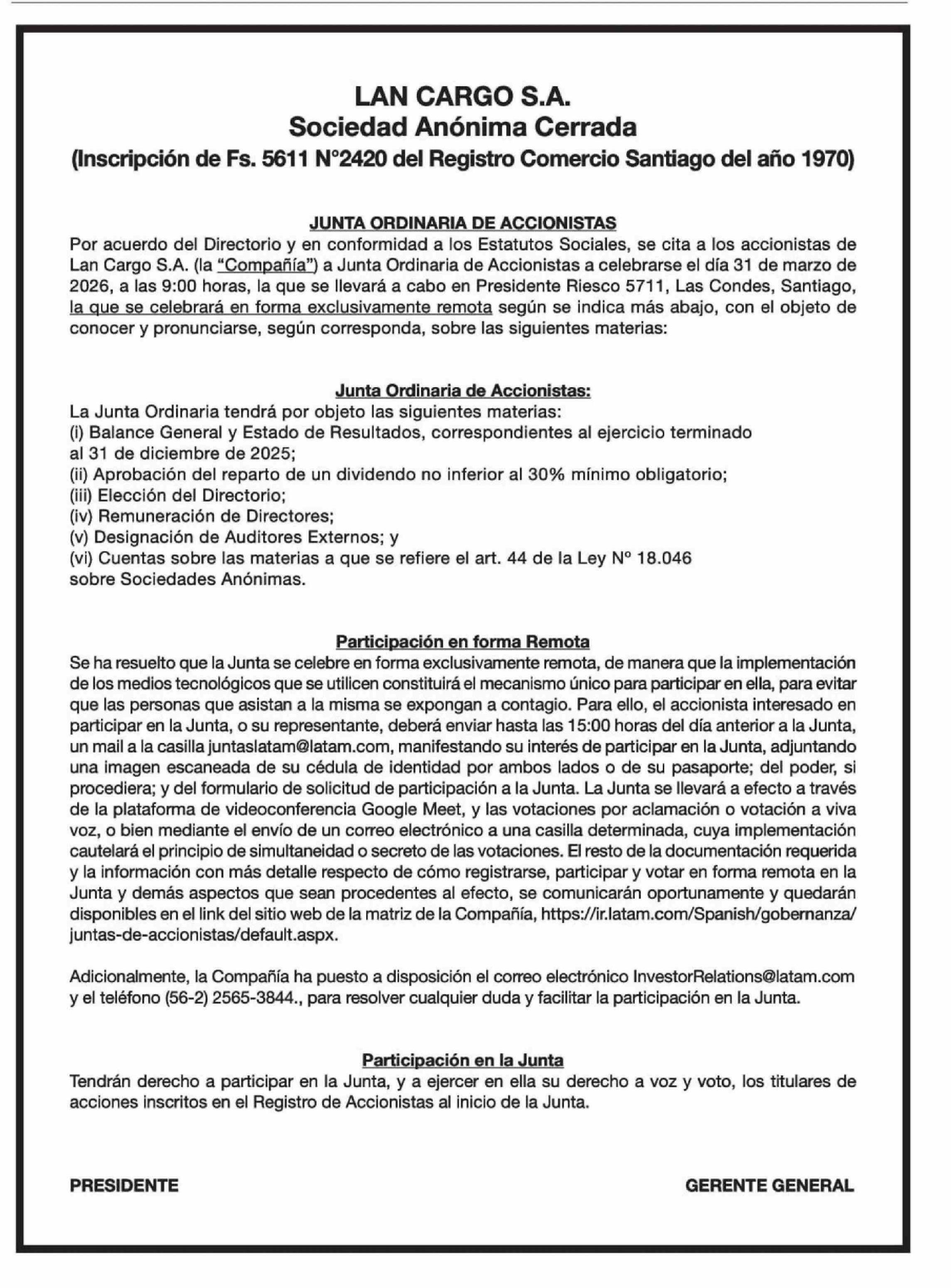 EXTRACTOS: LAN CARGO S.A. 27-03-2026 La Tercera |