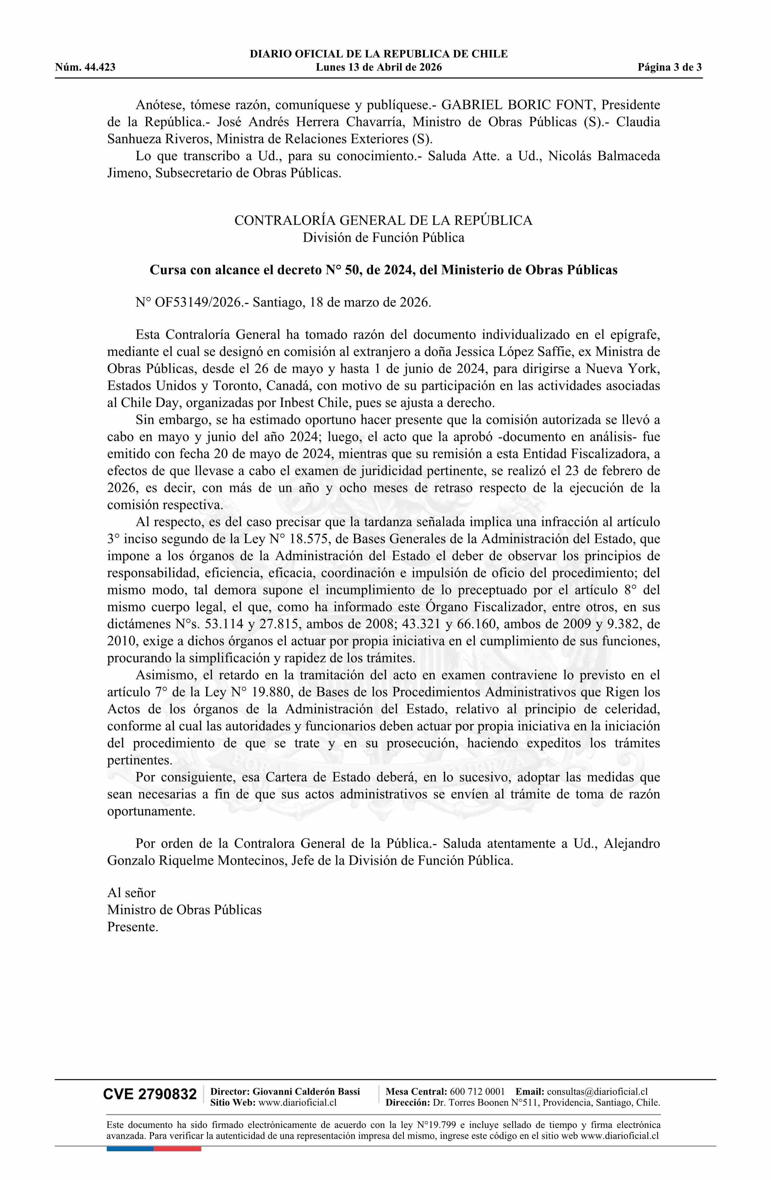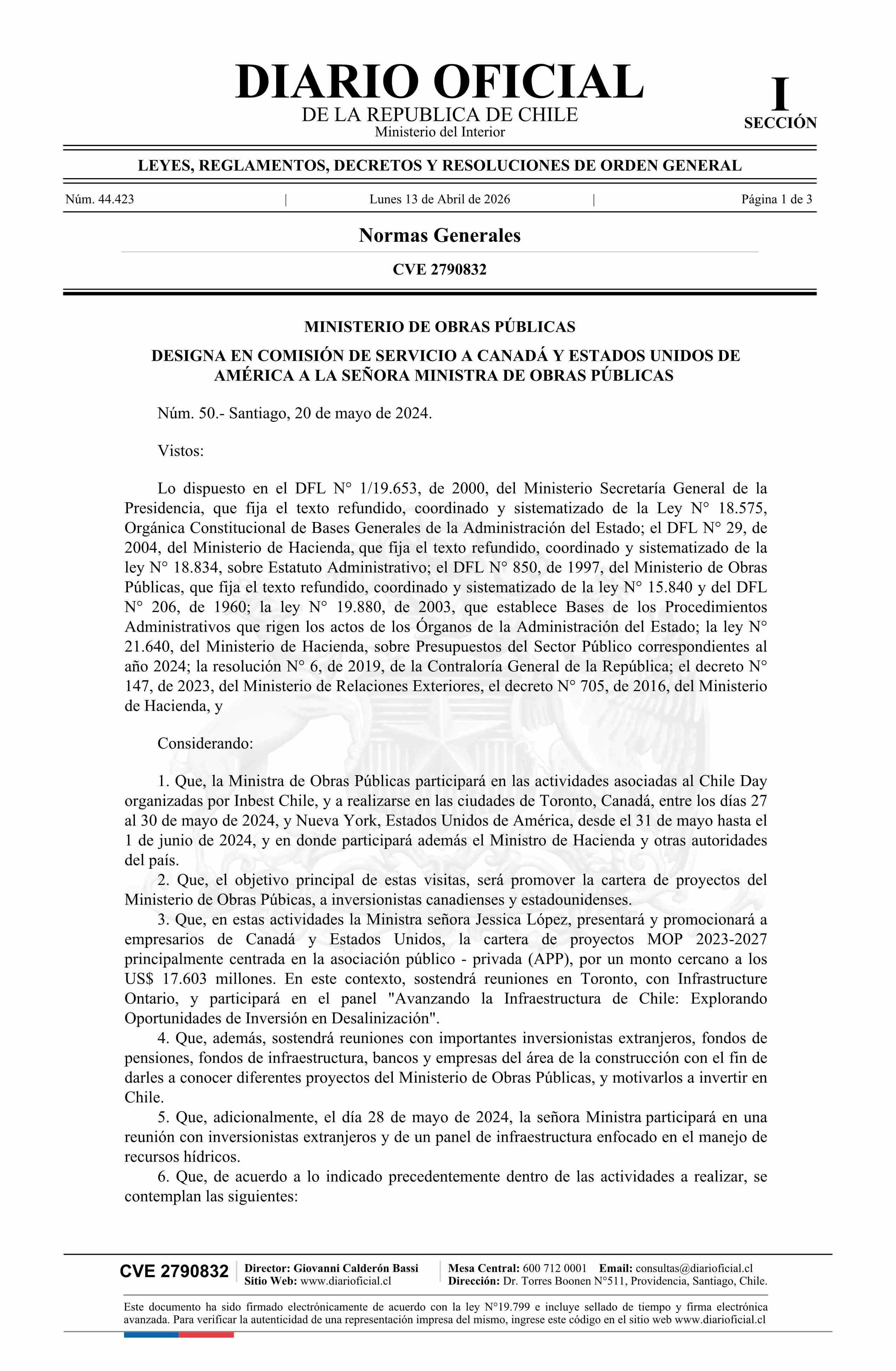 Decreto número 50, de 2024.- Designa en comisión de servicio al extranjero a doña Jessica López Saffie, Ministra de Obras Públicas, a Canadá y Estados Unidos de América 13-04-2026 Diario Oficial Edición Electrónica |