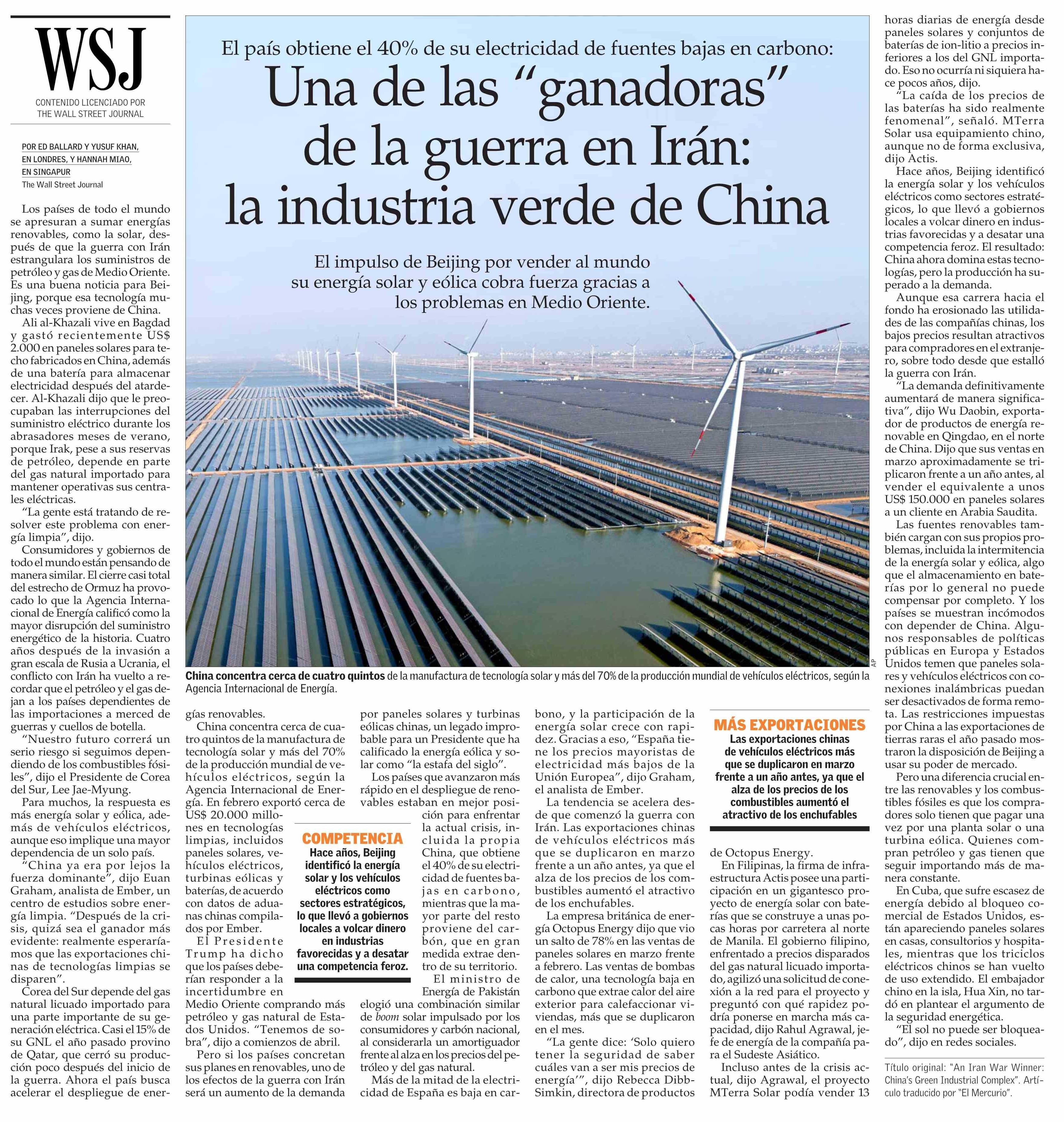 Una de las “ganadoras” de la guerra en Irán: la industria verde de China 14-04-2026 El Mercurio |