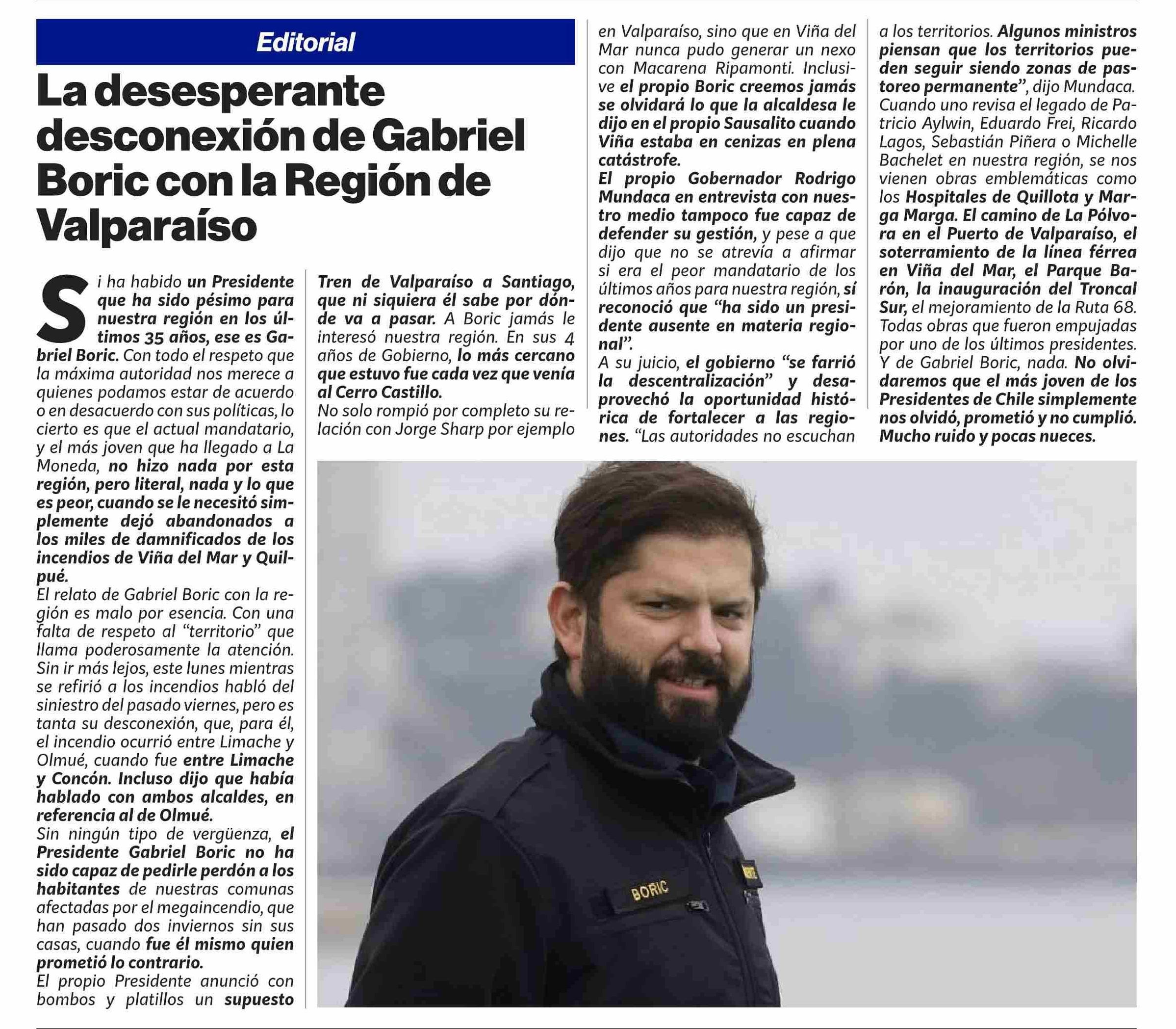 Título: EDITORIAL: La desesperante desconexión de Gabriel Boric con la Región de Valparaiso