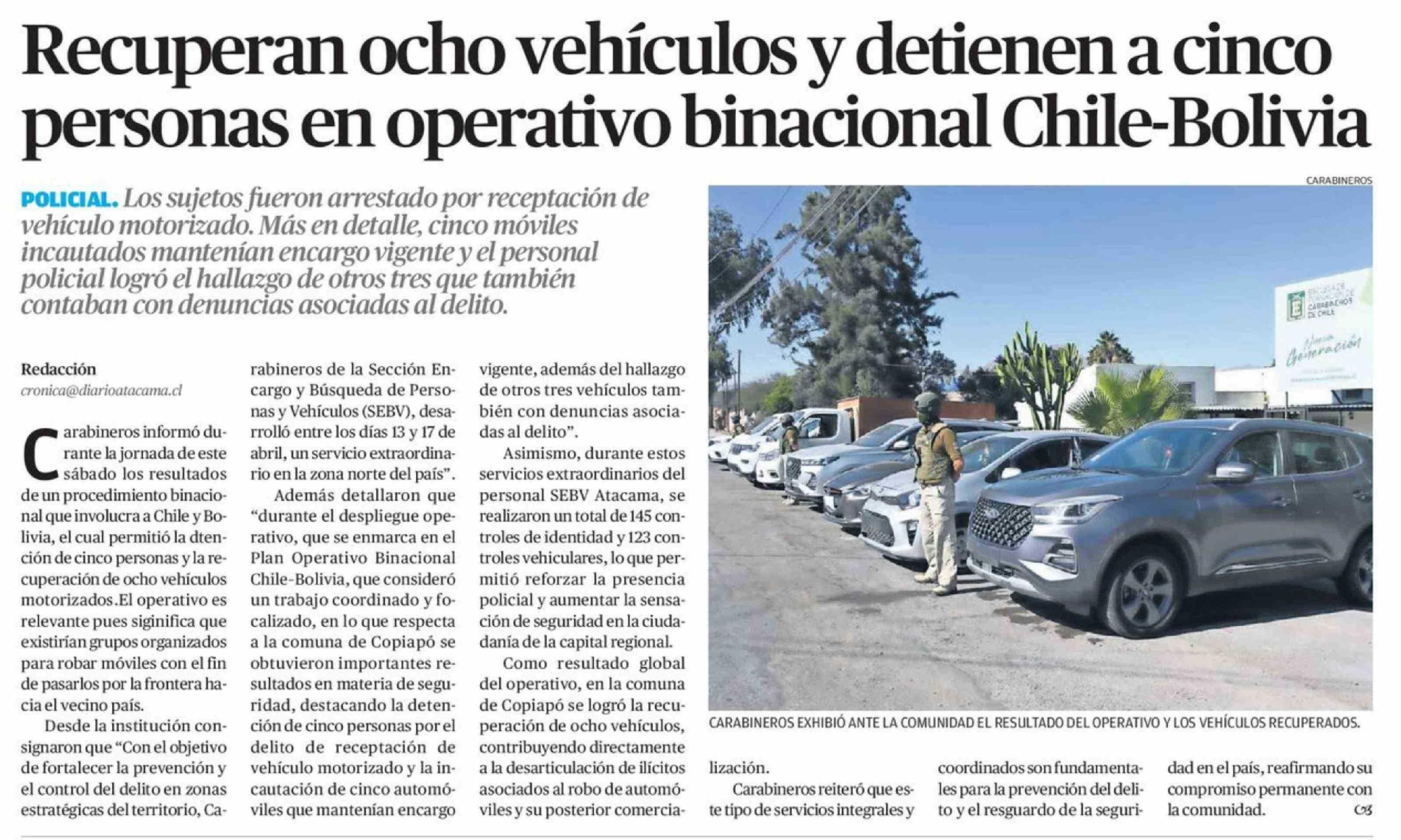 Título: Recuperan ocho vehículos y detienen a cinco personas en operativo binacional Chile-Bolivia