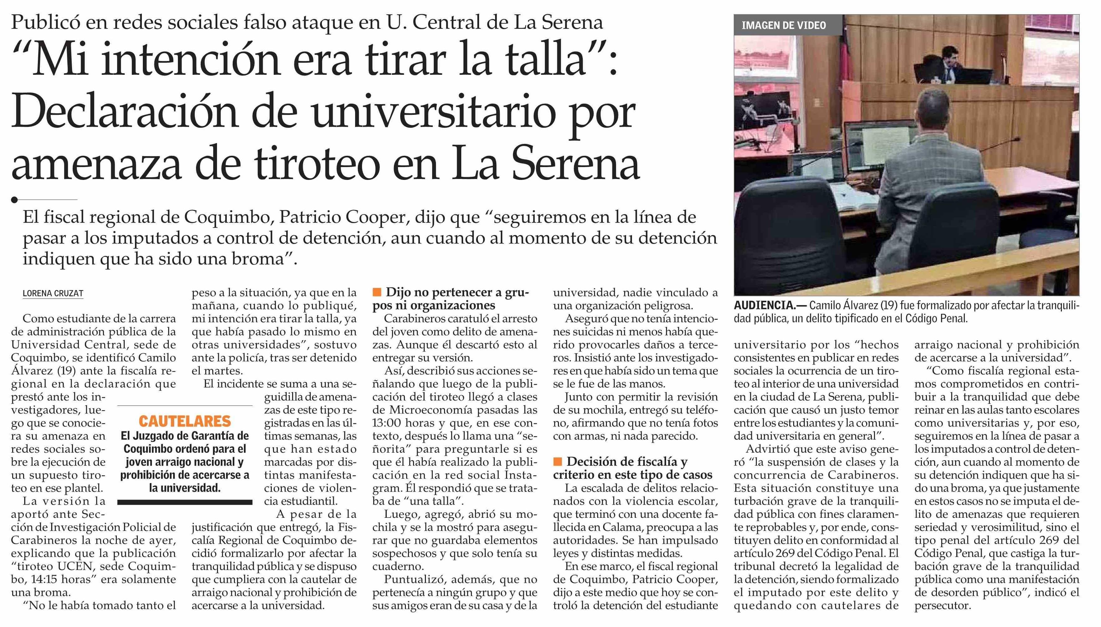 “Mi intención era tirar la talla”: Declaración de universitario por amenaza de tiroteo en La Serena 16-04-2026 El Mercurio |