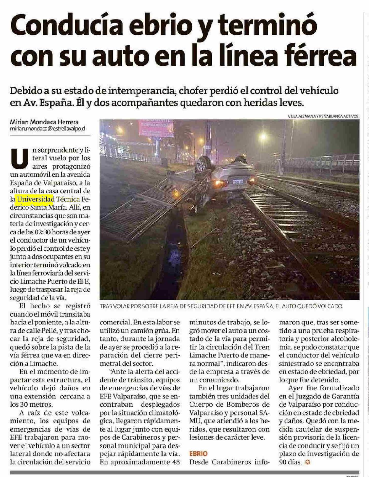 Conducía ebrio y terminó con su auto en la línea férrea 13-06-2025 La Estrella de Valparaíso |