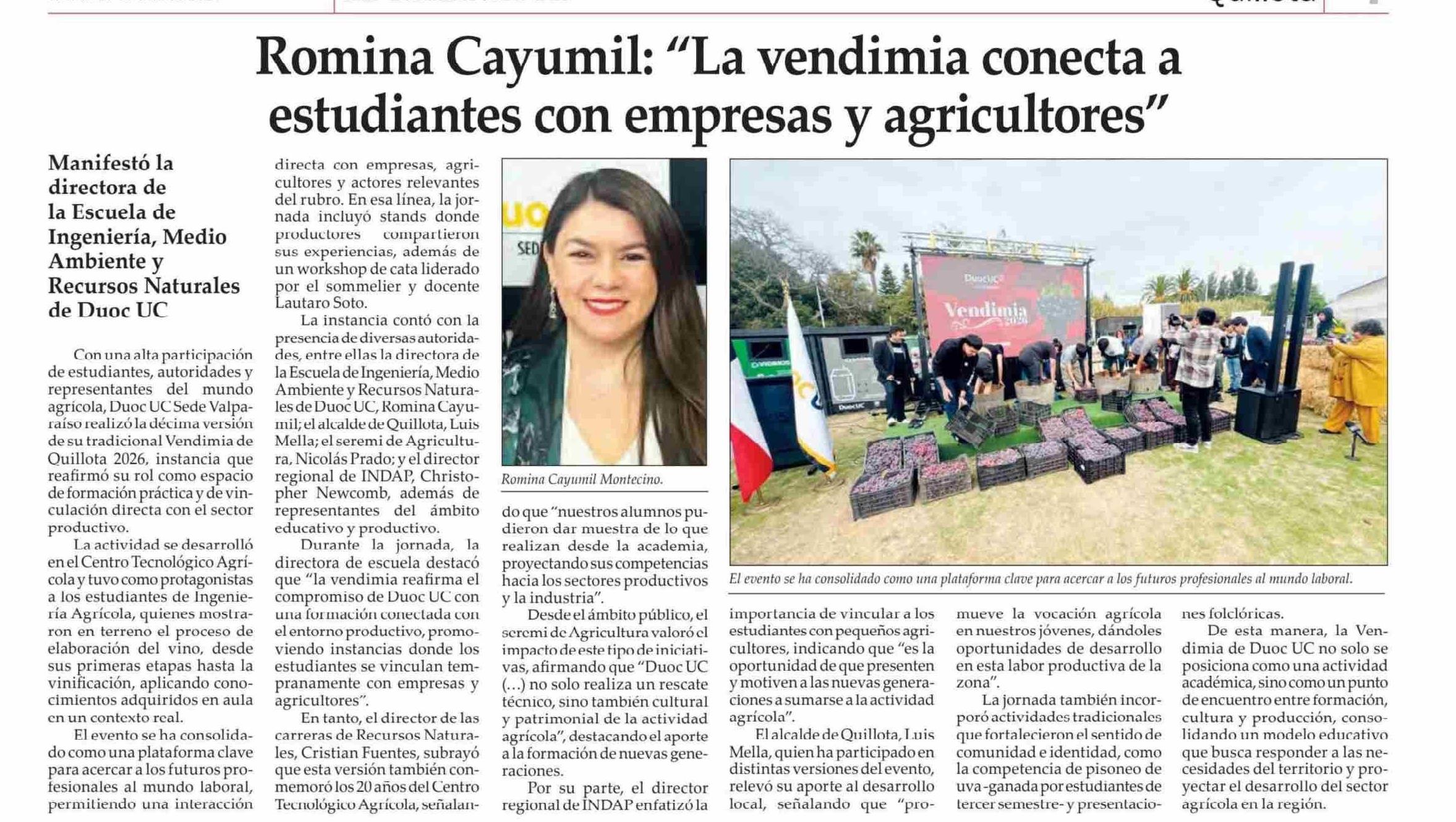 Título: Romina Cayumil: “La vendimia conecta a estudiantes con empresas v aericultores”