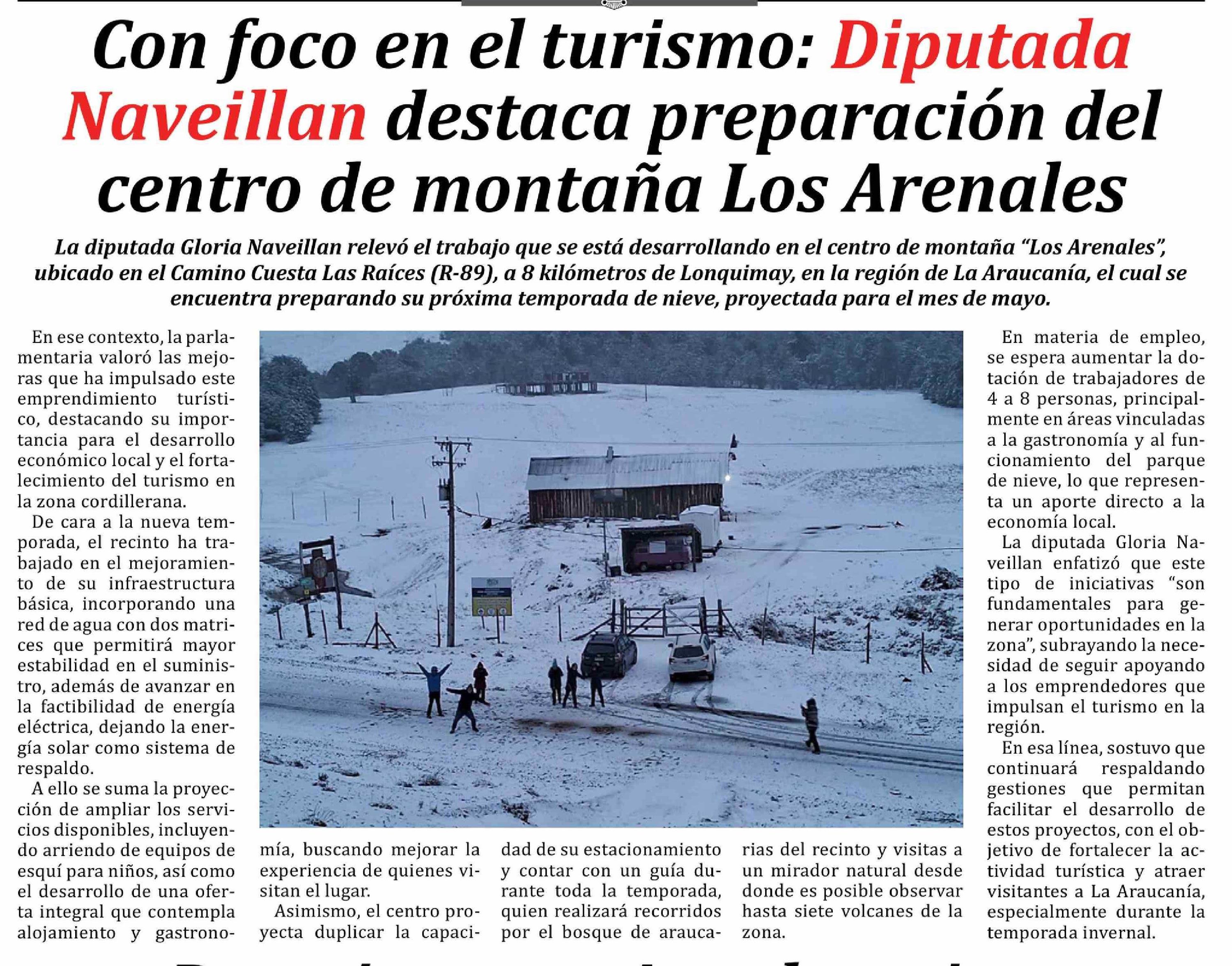 | Título: | Con foco en el turismo: Diputada Naveillan destaca preparación del centro de montaña Los Arenales |