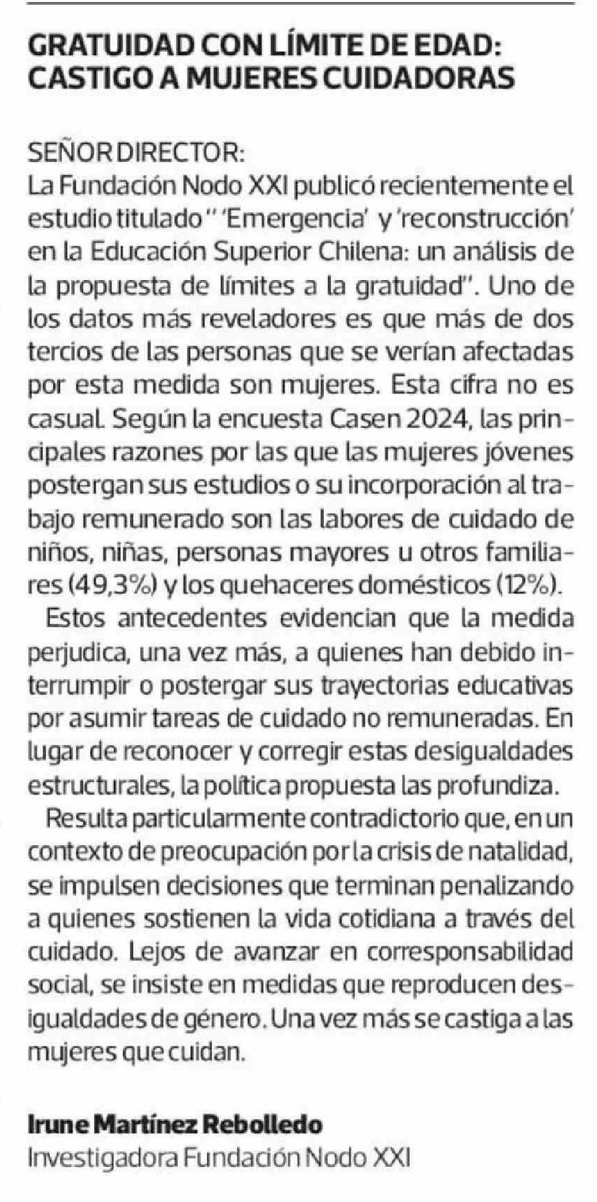 Cartas: GRATUIDAD CON LÍMITE DE EDAD: CASTIGO A MUJERES CUIDADORAS 27-03-2026 La Tercera |