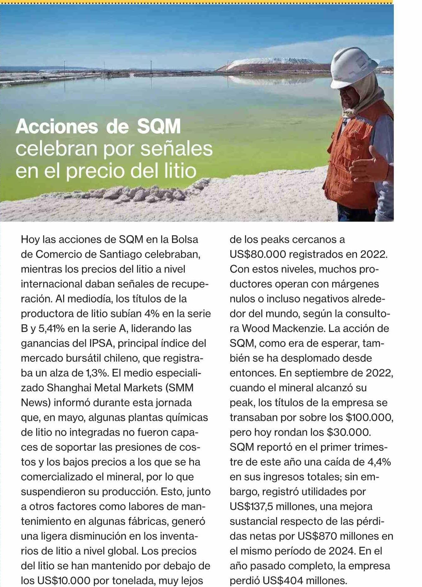 Acciones de SQM celebran por señales en el precio del litio 04-06-2025 La Segunda |