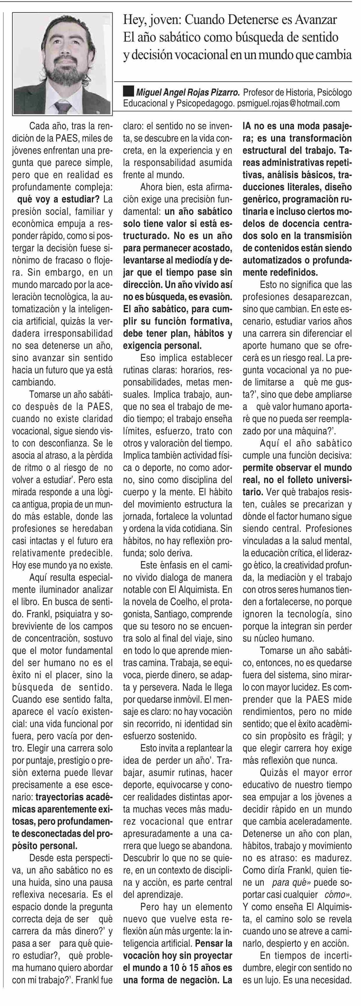 | Título: | Columnas de Opinión: Hey, joven: Cuando Detenerse es Avanzar El año sabático como búsqueda de sentido y decisión vocacional en un mundo que cambia |