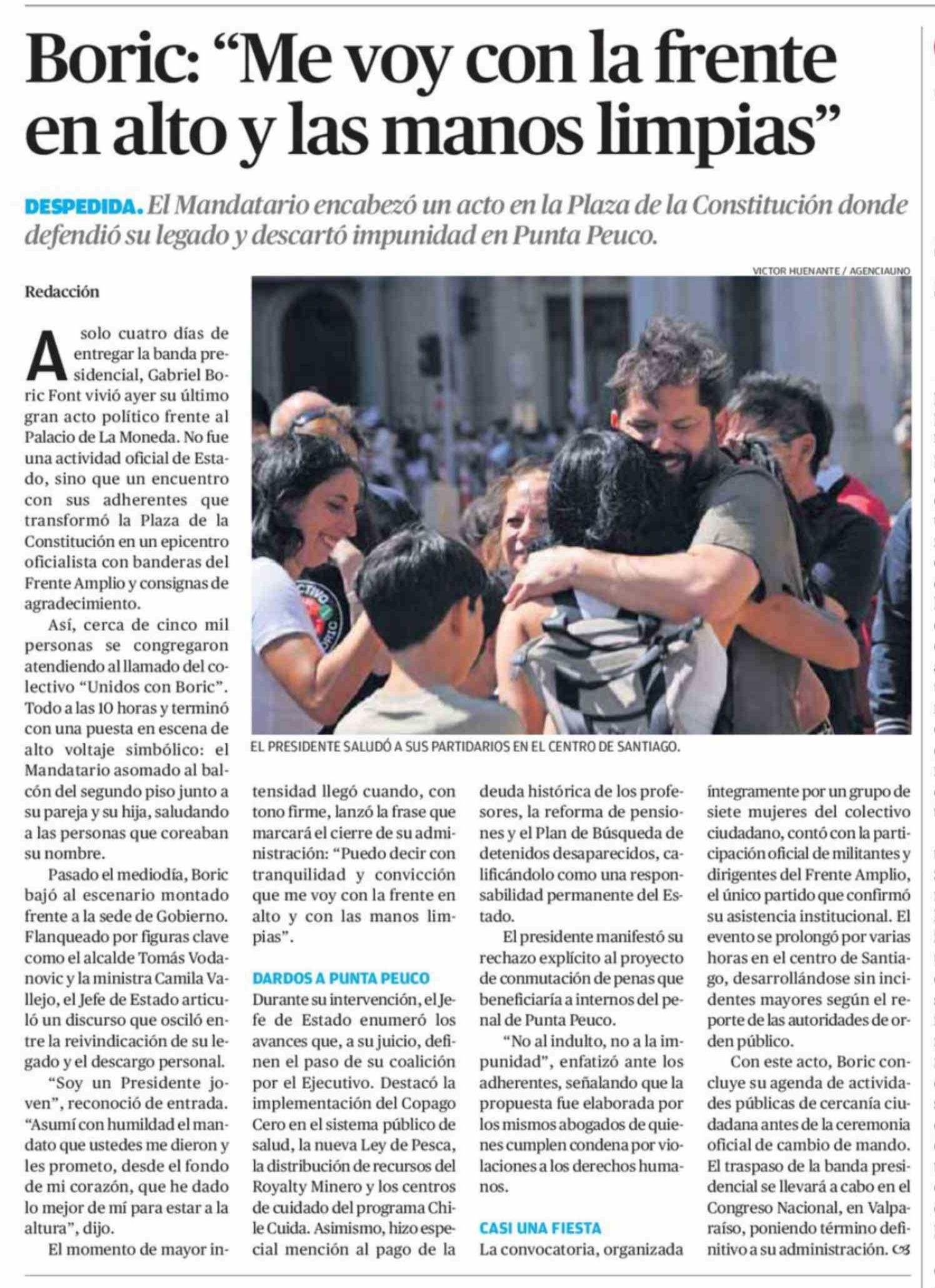 Título: Boric: "Me voy con la frente en alto y las manos limpias"