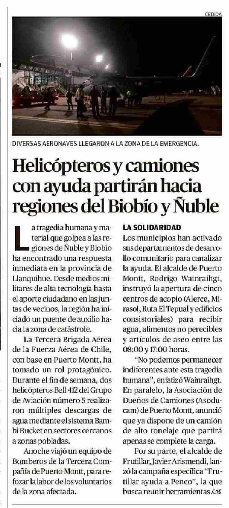 Helicópteros y camiones con ayuda partirán hacia regiones del Biobío y Ñuble 20-01-2026 El Llanquihue |