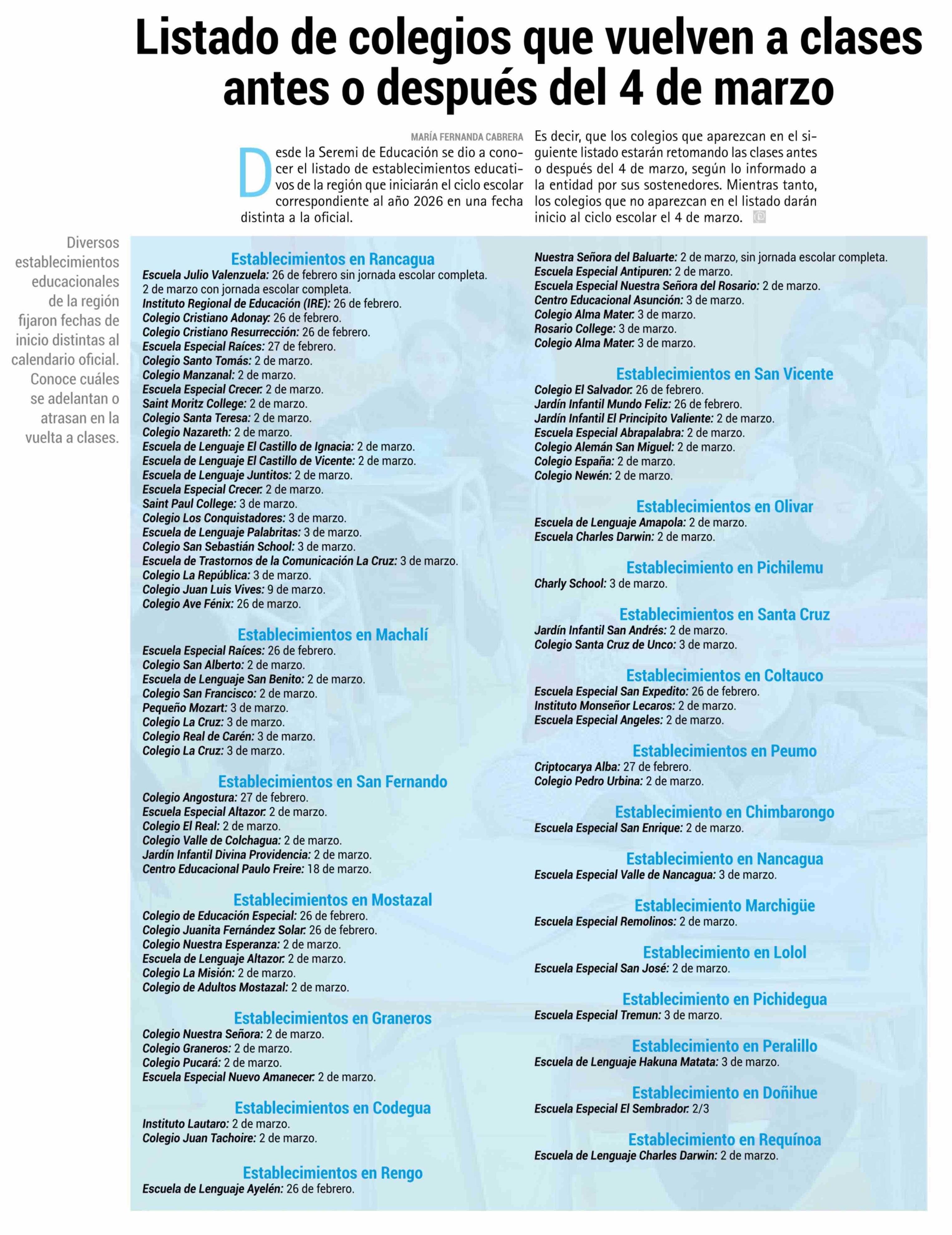 Título: Listado de colegios que vuelven a clases antes o después del 4 de marzo