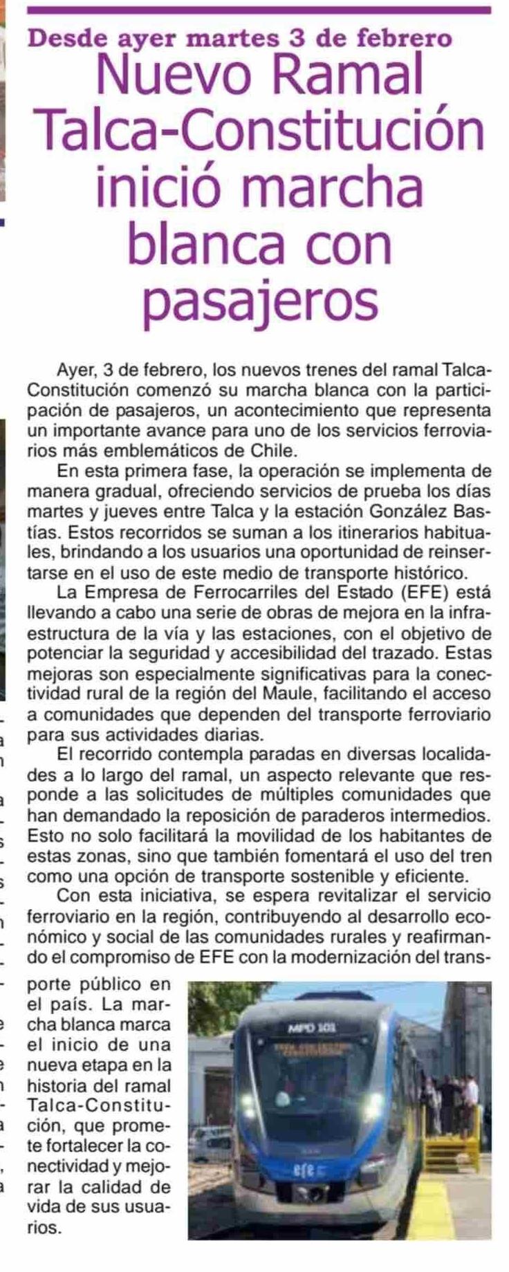 Título: Nuevo Ramal Talca-Constitución inició marcha blanca con pasajeros