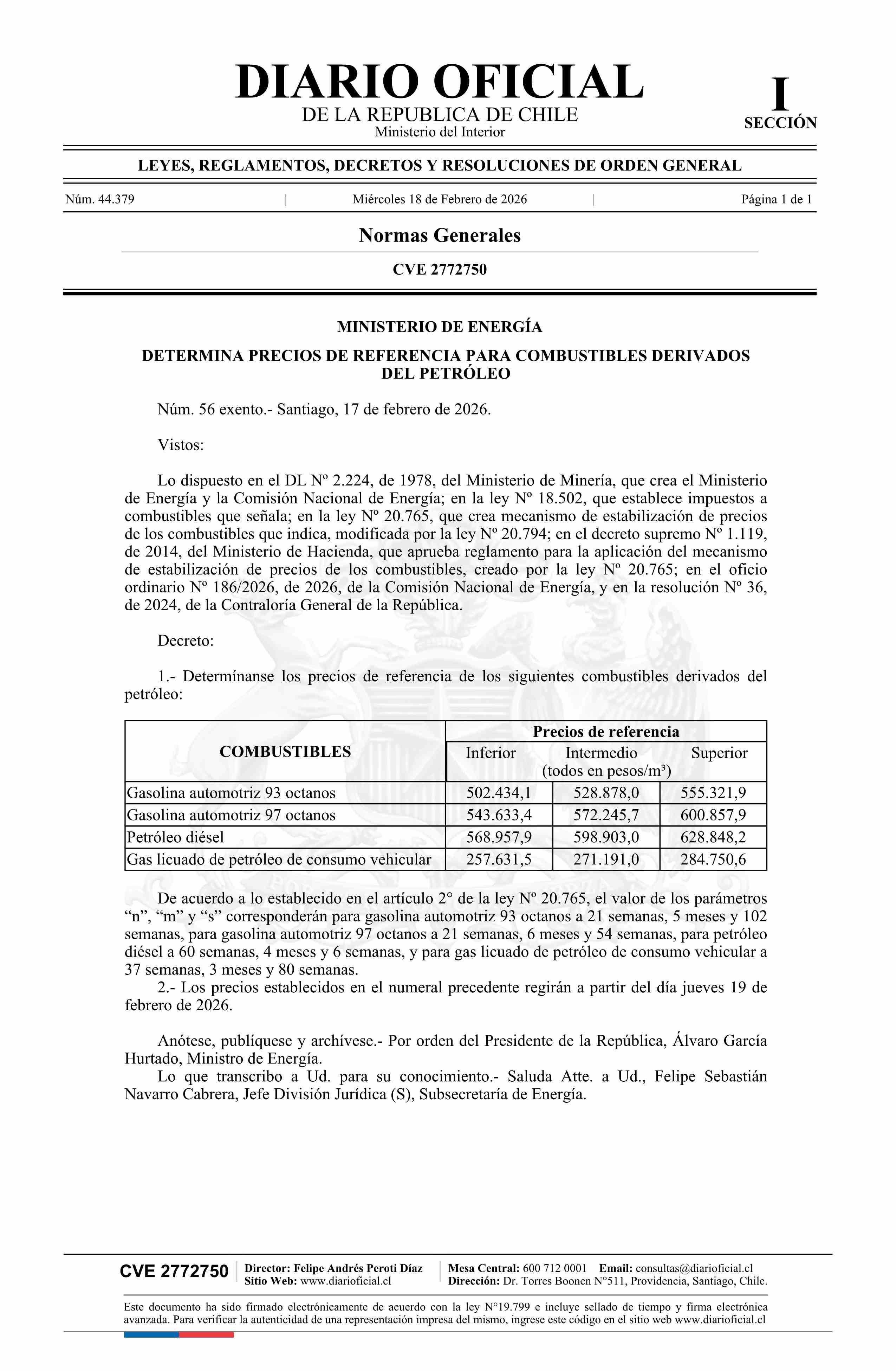 Título: Decreto exento número 56, de 2026.- Determina precios de referencia para combustibles derivados del petróleo