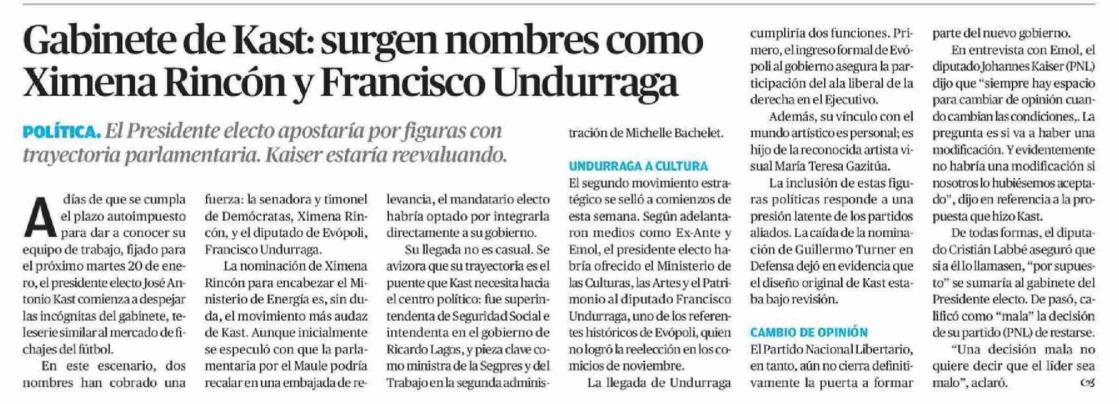 Gabinete de Kast: surgen nombres como Ximena Rincón y Francisco Undurraga 17-01-2026 El Mercurio de Calama |