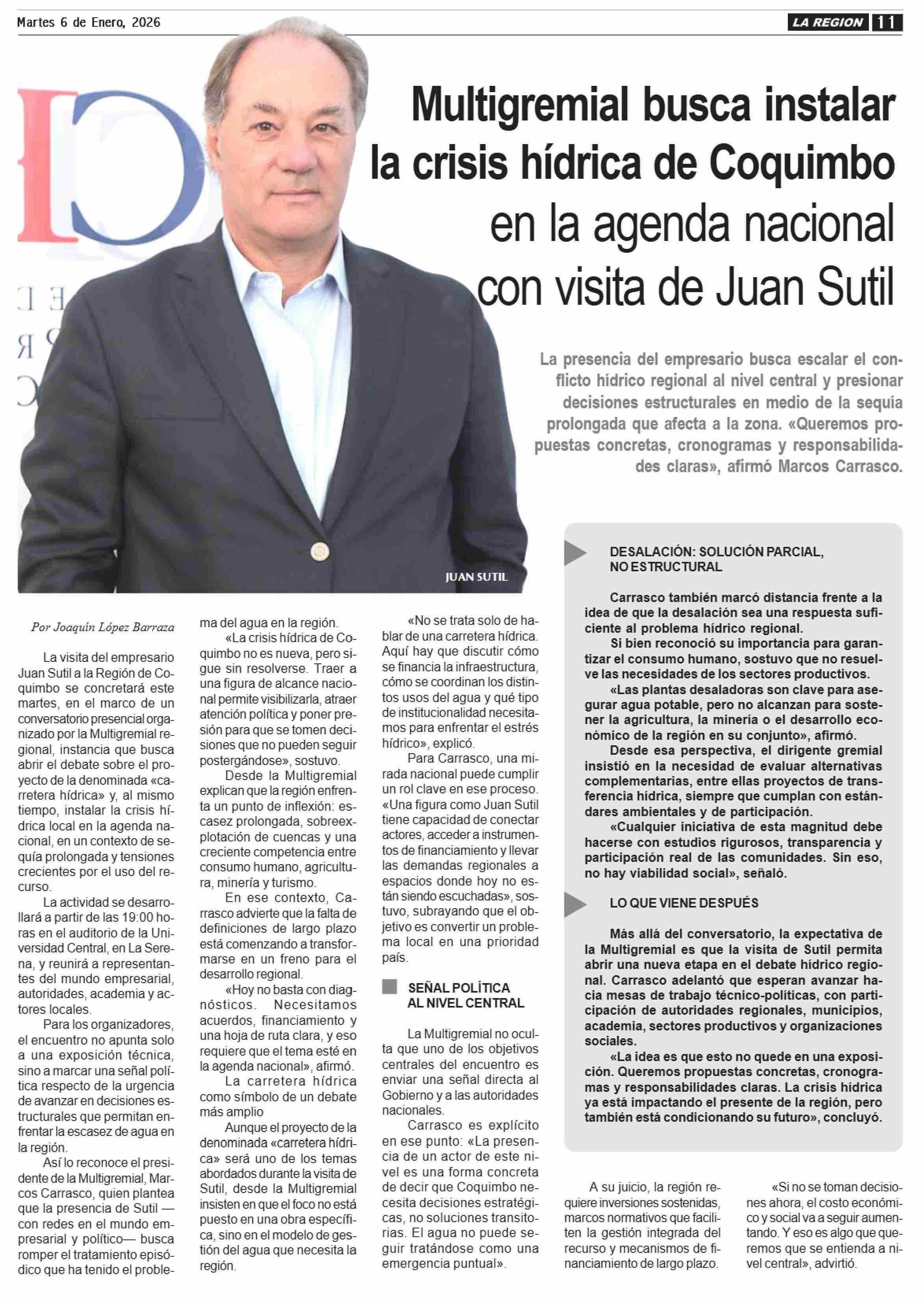 Título: Multigremial busca instalar la crisis hídrica de Coquimbo en la agenda nacional con visita de Juan Sutil