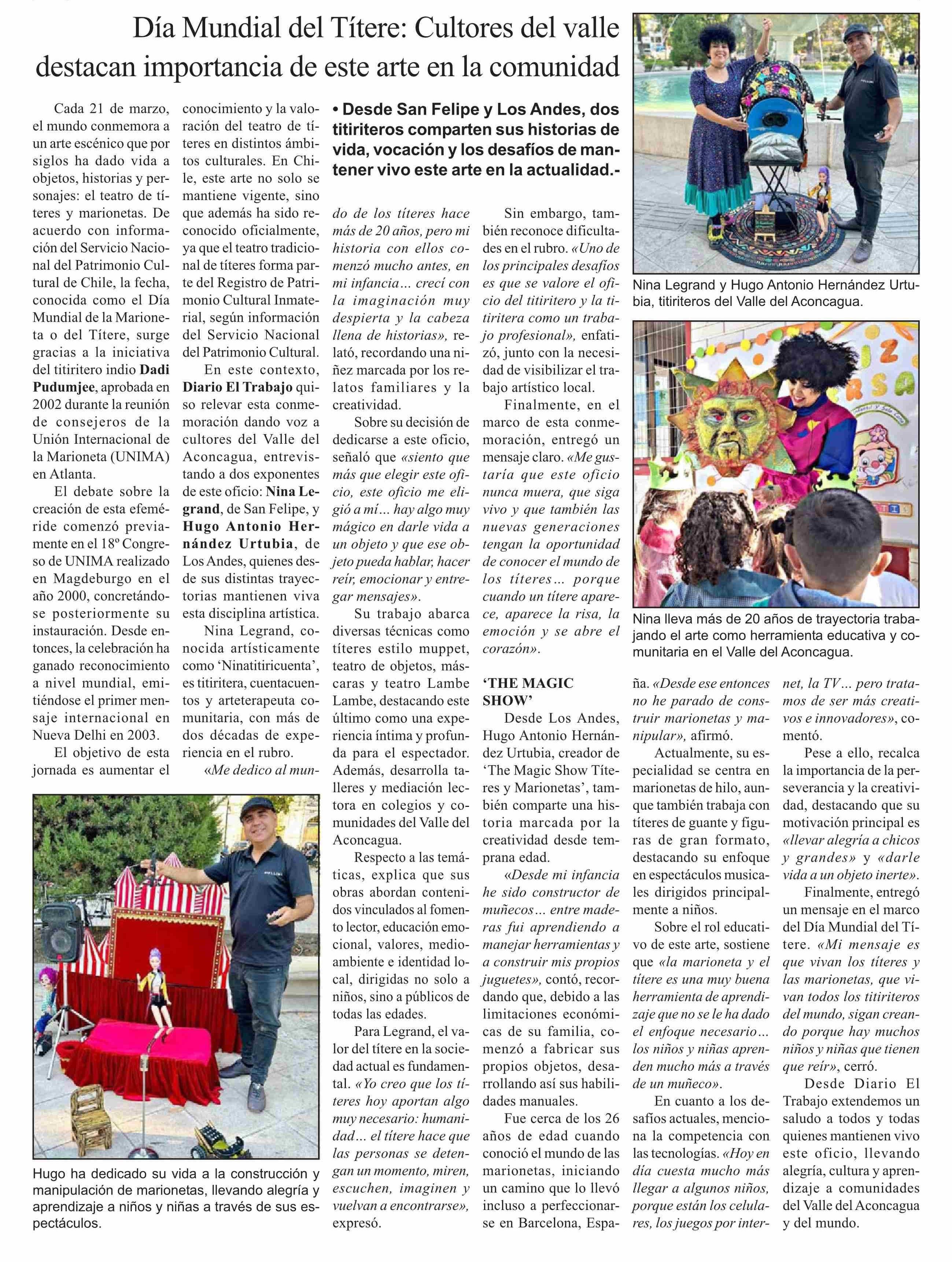 Día Mundial del Títere: Cultores del valle destacan importancia de este arte en la comunidad 23-03-2026 El Trabajo |