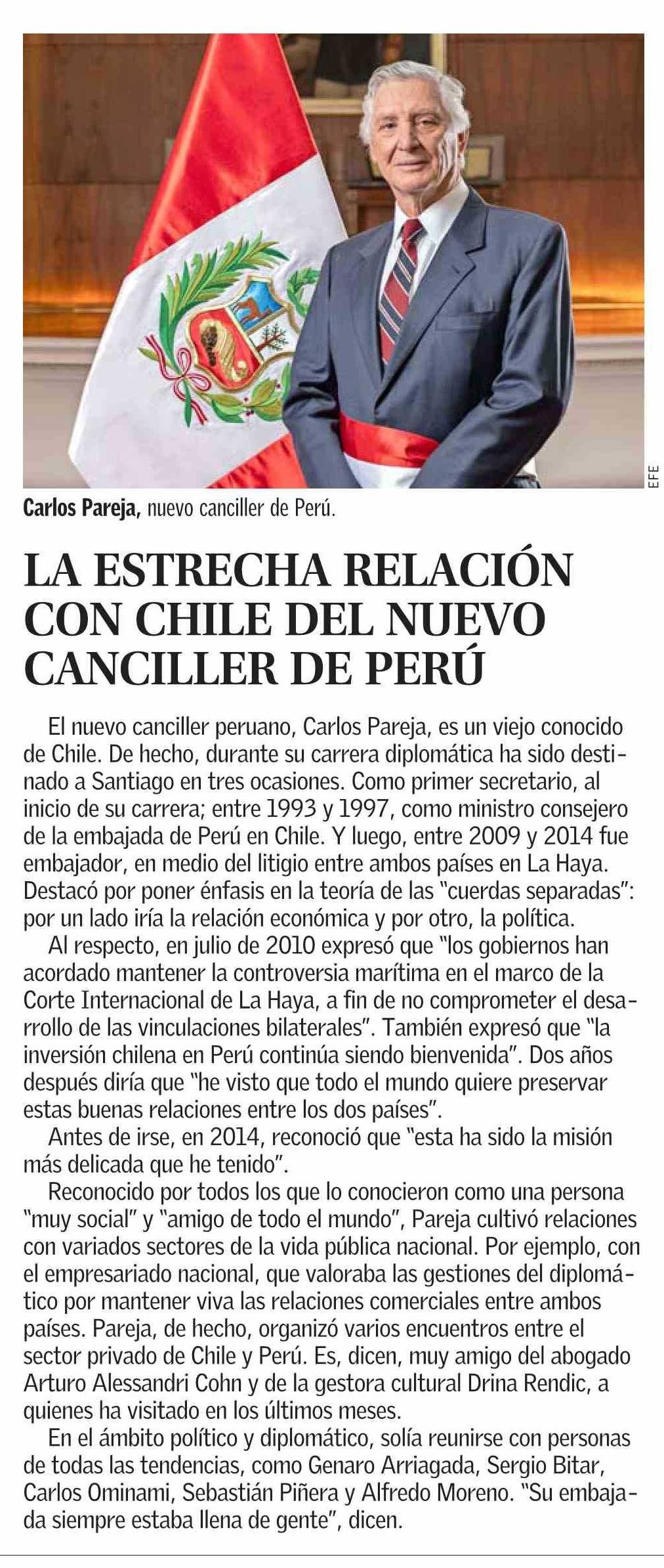 LA ESTRECHA RELACIÓN CON CHILE DEL NUEVO CANCILLER DE PERÚ 26-04-2026 El Mercurio |