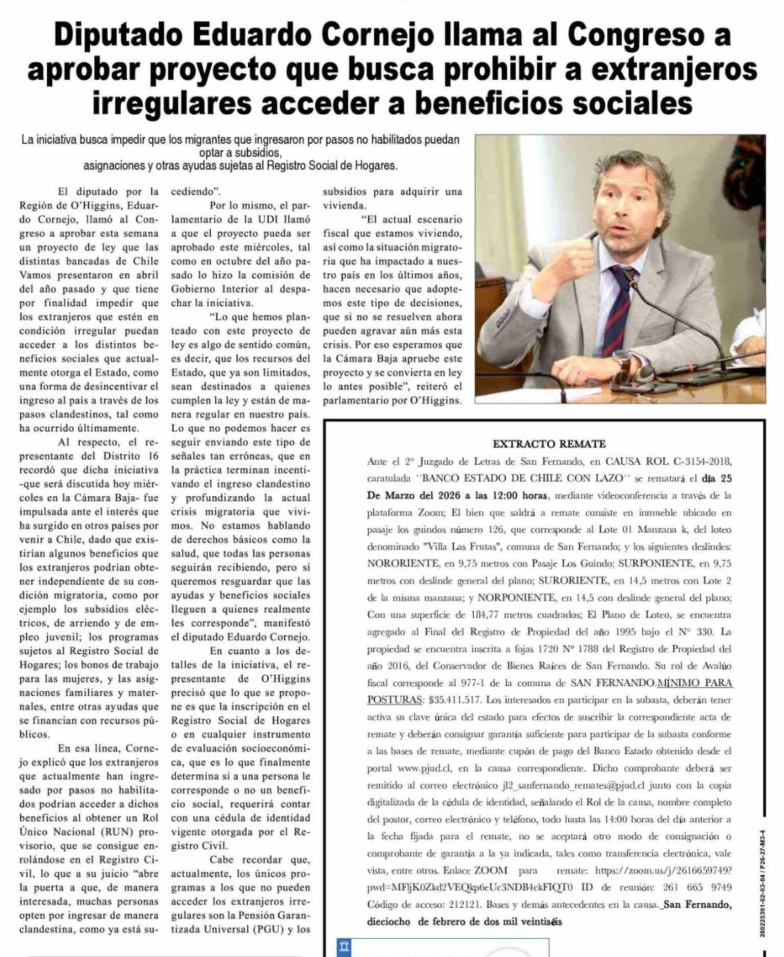Diputado Eduardo Cornejo llama al Congreso a aprobar proyecto que busca prohibir a extranjeros irregulares acceder a beneficios sociales 04-03-2026 Diario VI Región |