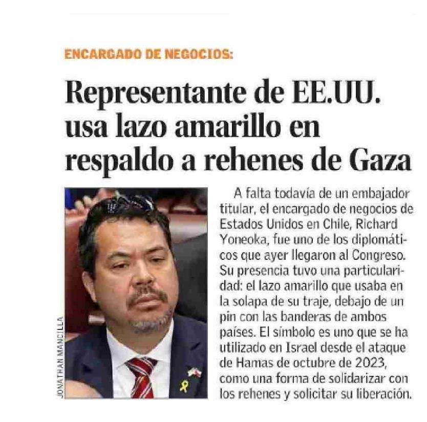 Representante de EE.UU. usa lazo amarillo en respaldo a rehenes de Gaza 02-06-2025 El Mercurio |