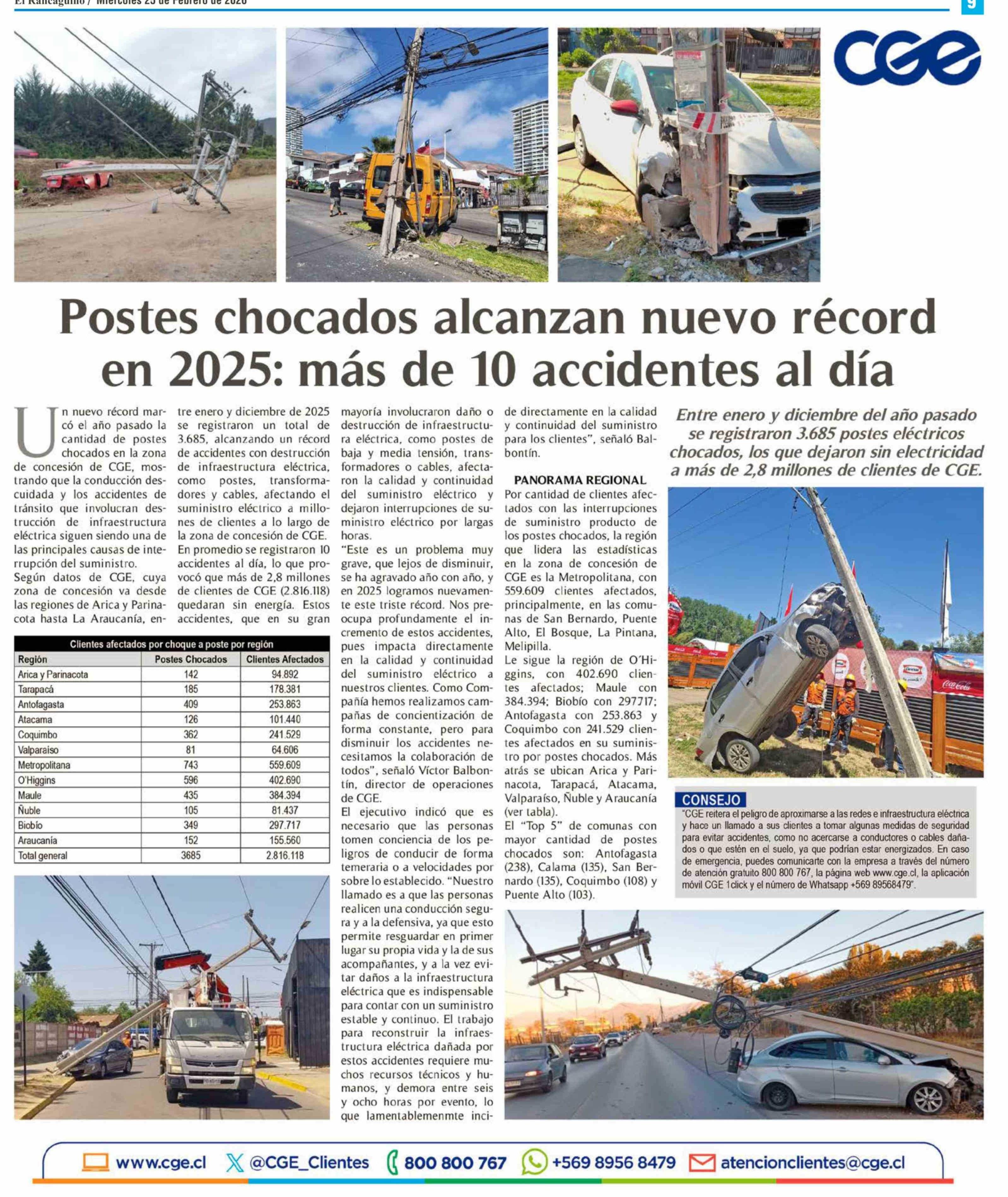 Postes chocados alcanzan nuevo récord en 2025: más de 10 accidentes al día 25-02-2026 El Rancagüino |