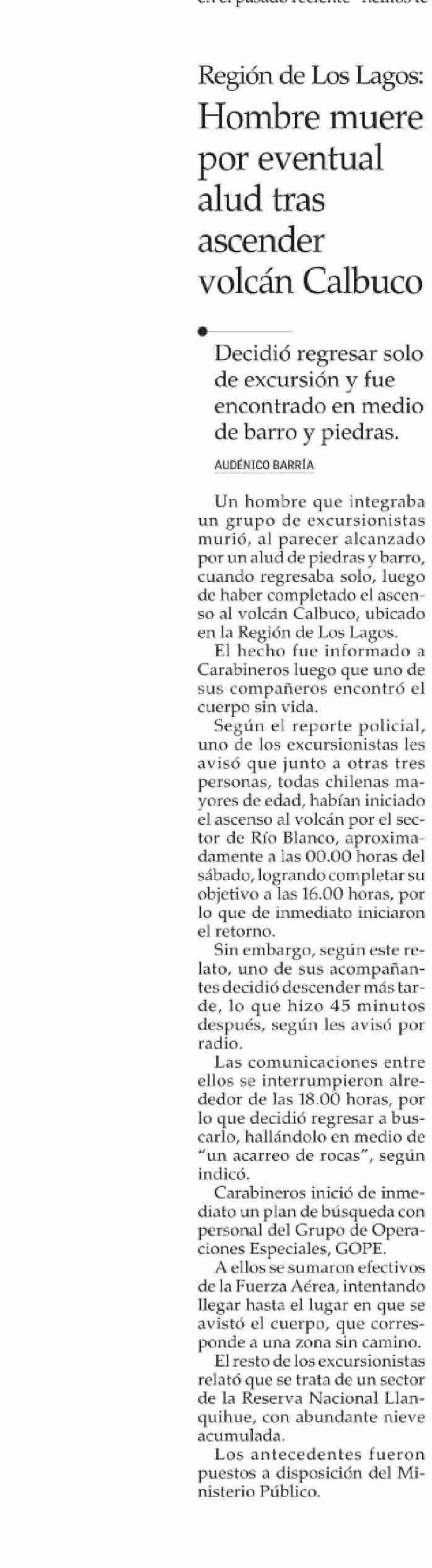 | Título: | Hombre muere por eventual alud tras ascender volcán Calbuco |