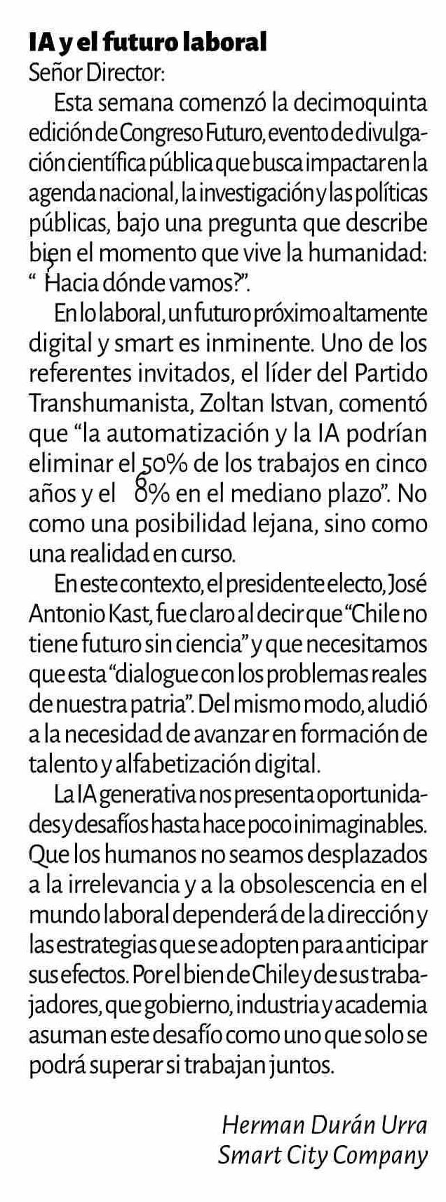 Cartas: IA y el futuro laboral Señor Director: Esta semana comenzó la decimoquinta ediciónde Congreso Futuro, evento de divulgación científica pública que busca impactar en la agenda nacional, la investigacióny las políticas públicas, bajo una pregunta que describe bien el momento que vive la humani