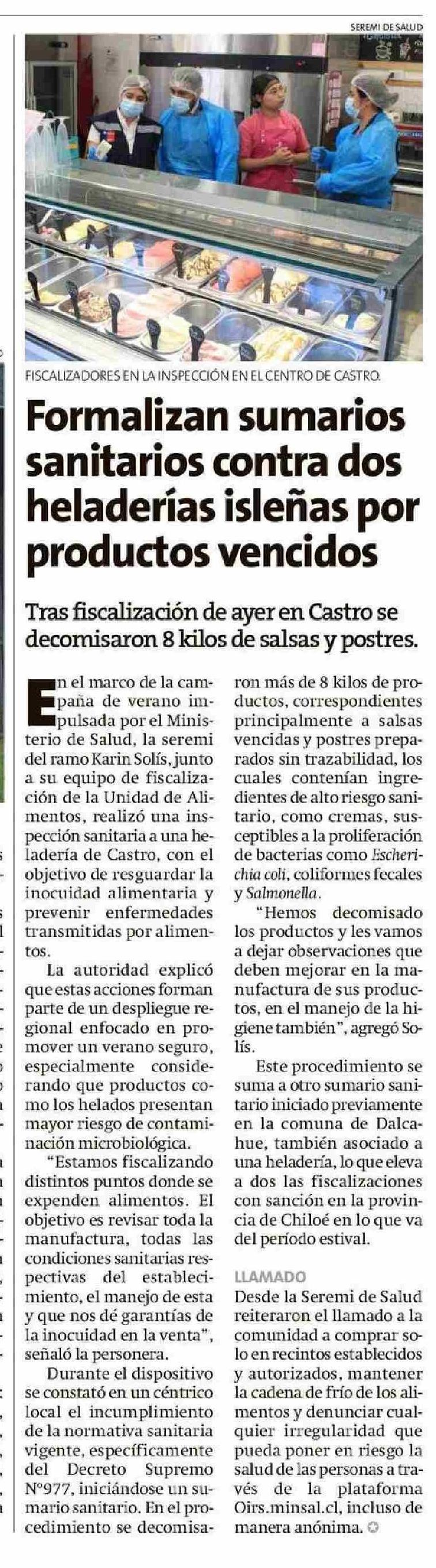 Título: Formalizan sumarios sanitarios contra dos heladerías isleñas por productos vencidos