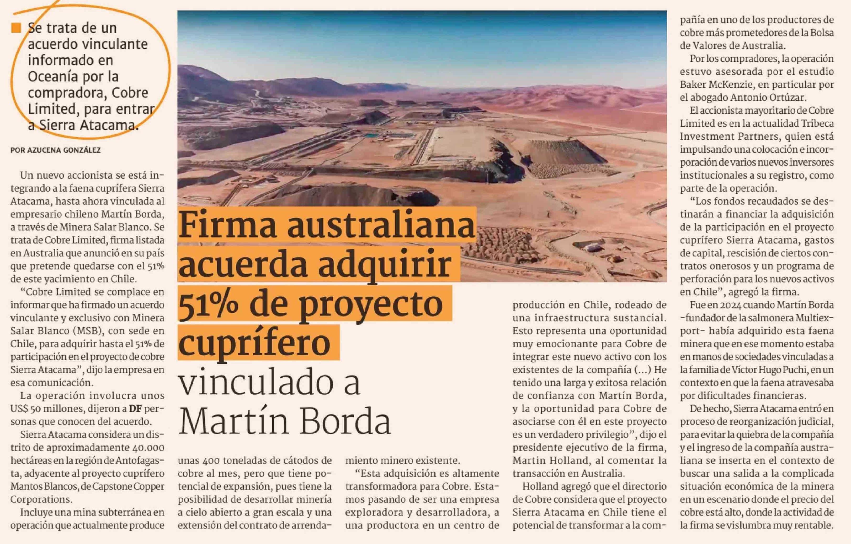 Título: Firma australiana acuerda adquirir 51% de proyecto cuprífero vinculado a Martín Borda