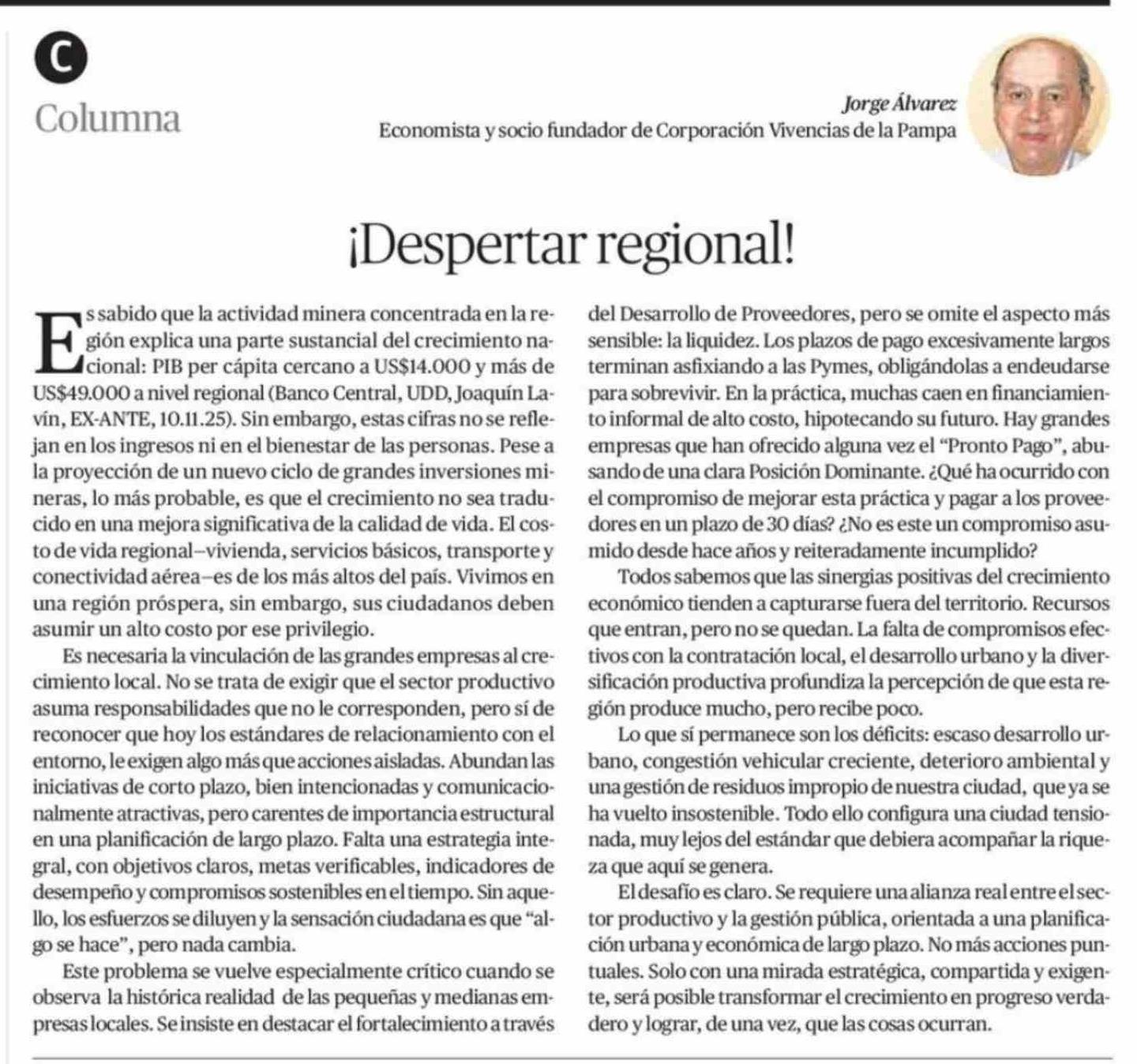 Columnas de Opinión: ¡Despertar regional! 14-04-2026 El Mercurio de Calama |