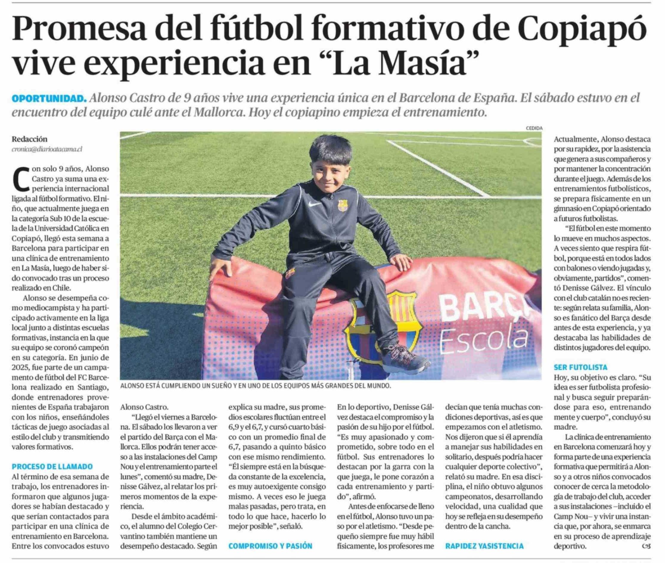 Promesa del fútbol formativo de Copiapó vive experiencia en "La Masía" 09-02-2026 El Diario de Atacama |
