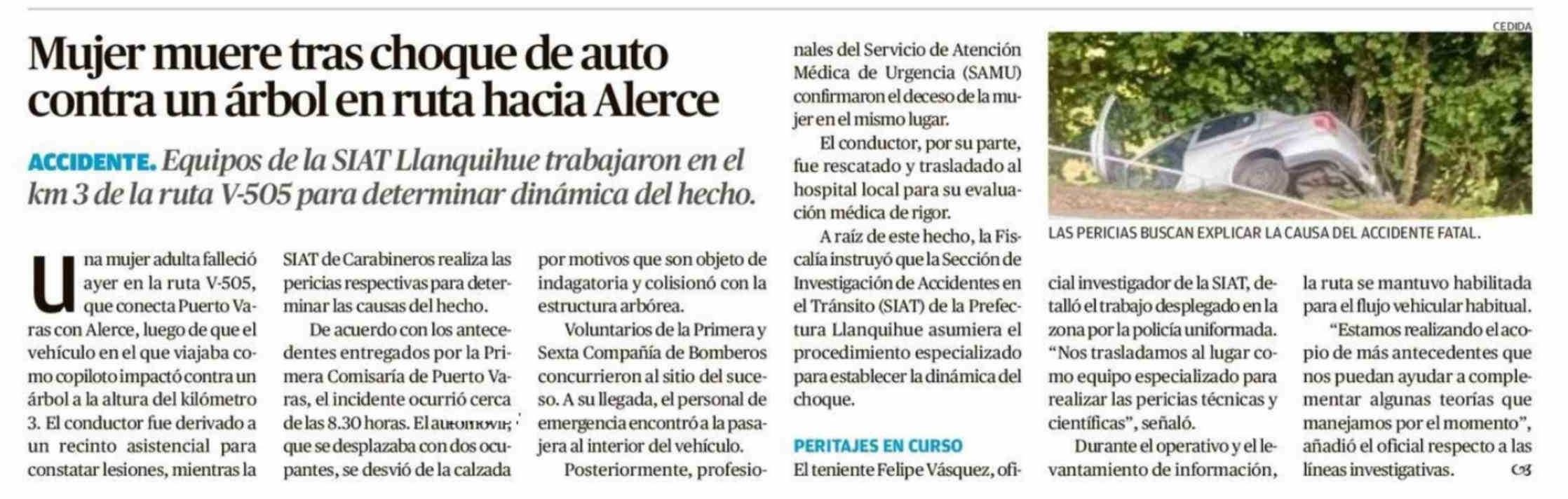Título: Mujer muere tras choque de auto contra un árbol en ruta hacia Alerce