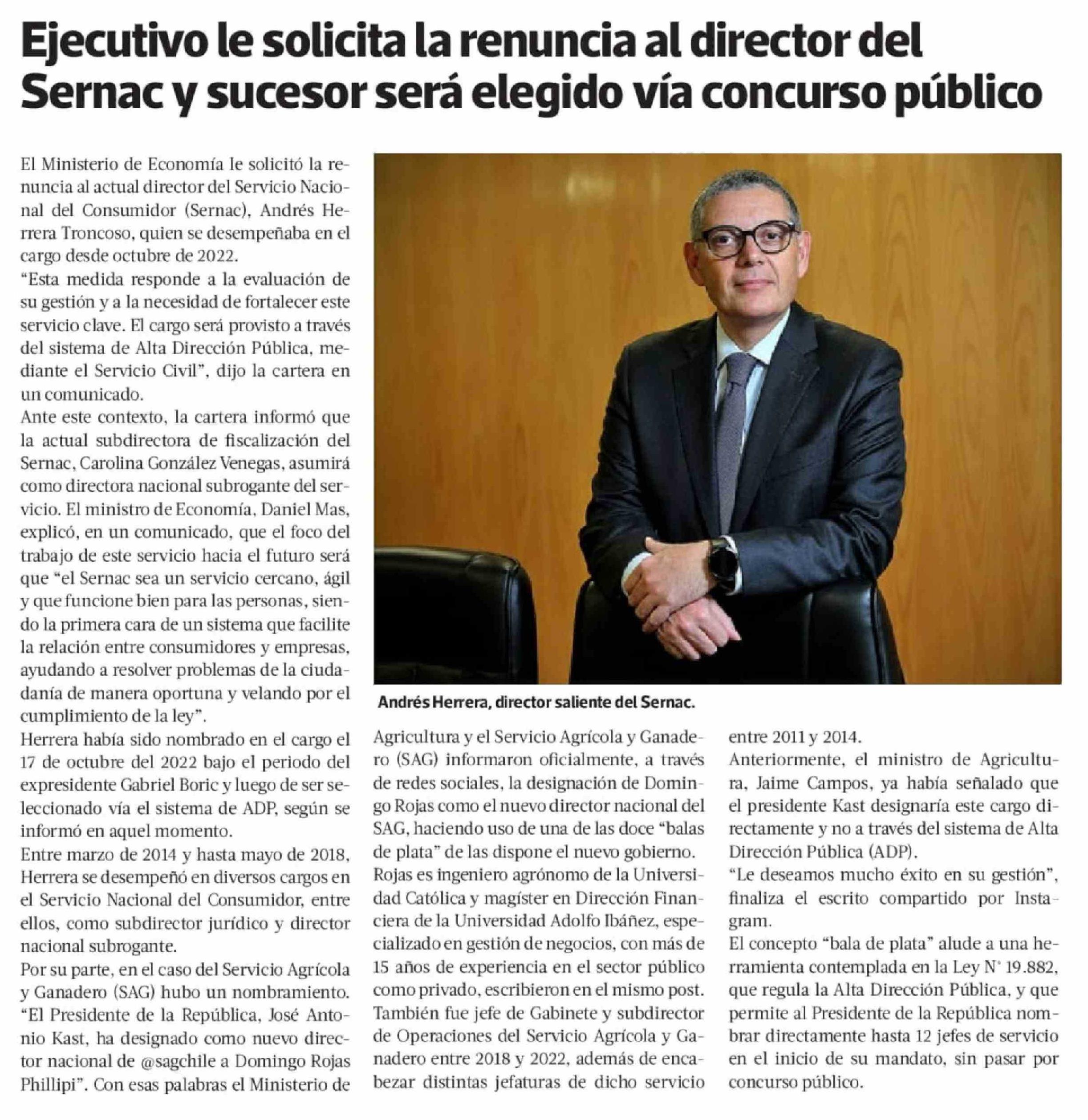 Ejecutivo le solicita la renuncia al director del Sernac y sucesor será elegido vía concurso público 31-03-2026 La Tercera |