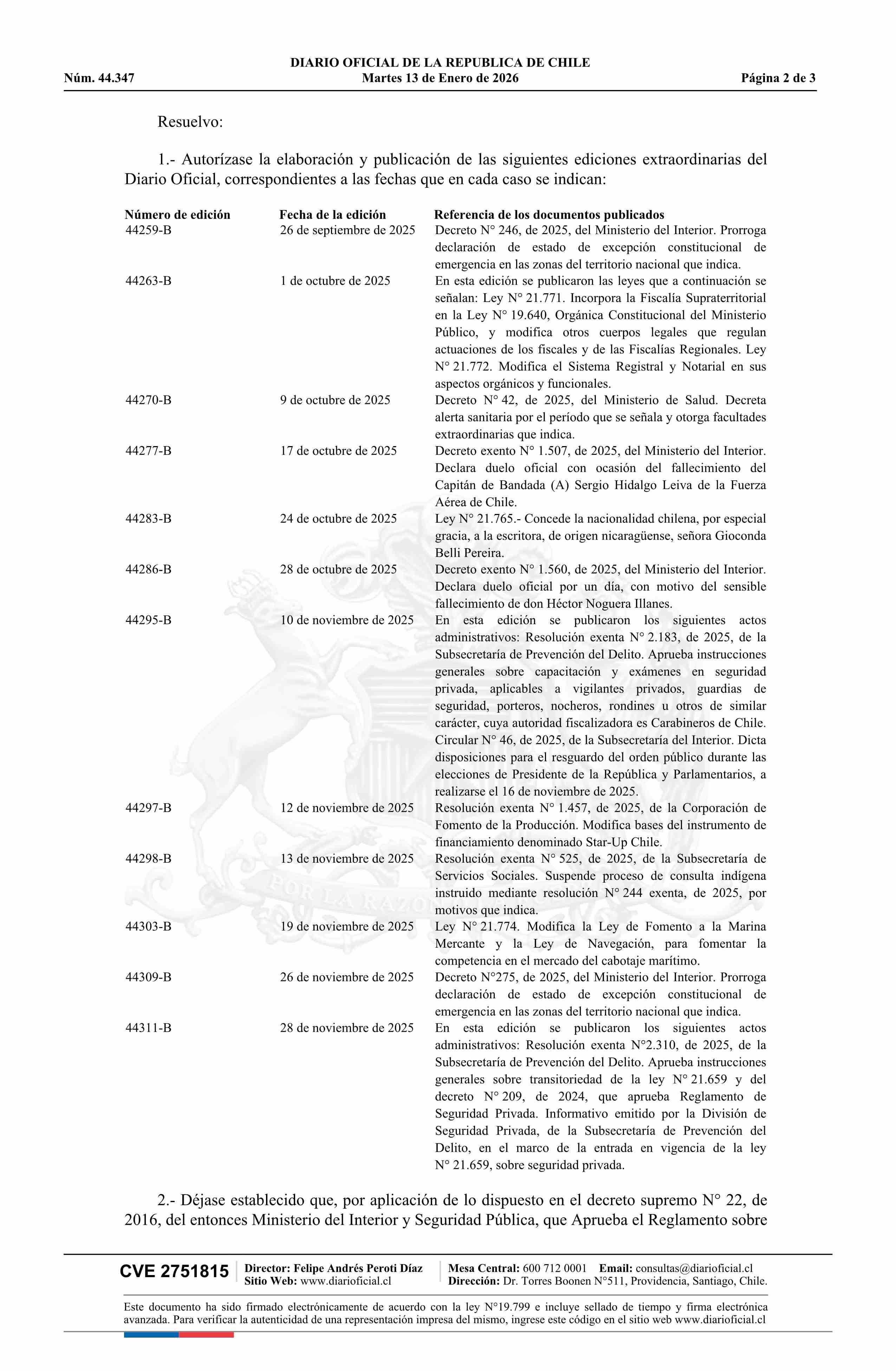 Resolución exenta número 7.083, de 2025.- Autoriza ediciones extraordinarias del Diario Oficial para los días que indica 13-01-2026 DIARIO OFICIAL CHILE - BOLETÍN OFICIAL DE MINERÍA |