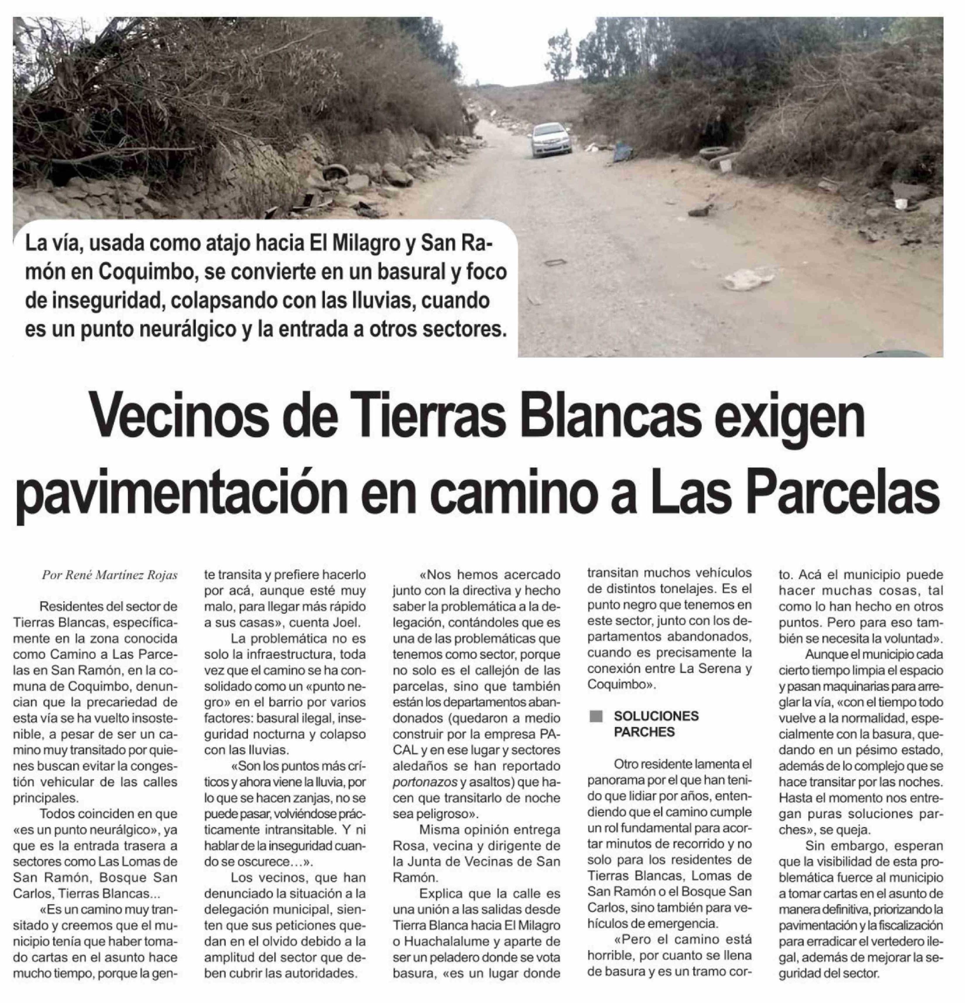 Vecinos de Tierras Blancas exigen pavimentación en camino a Las Parcelas 08-04-2026 Diario la Región |