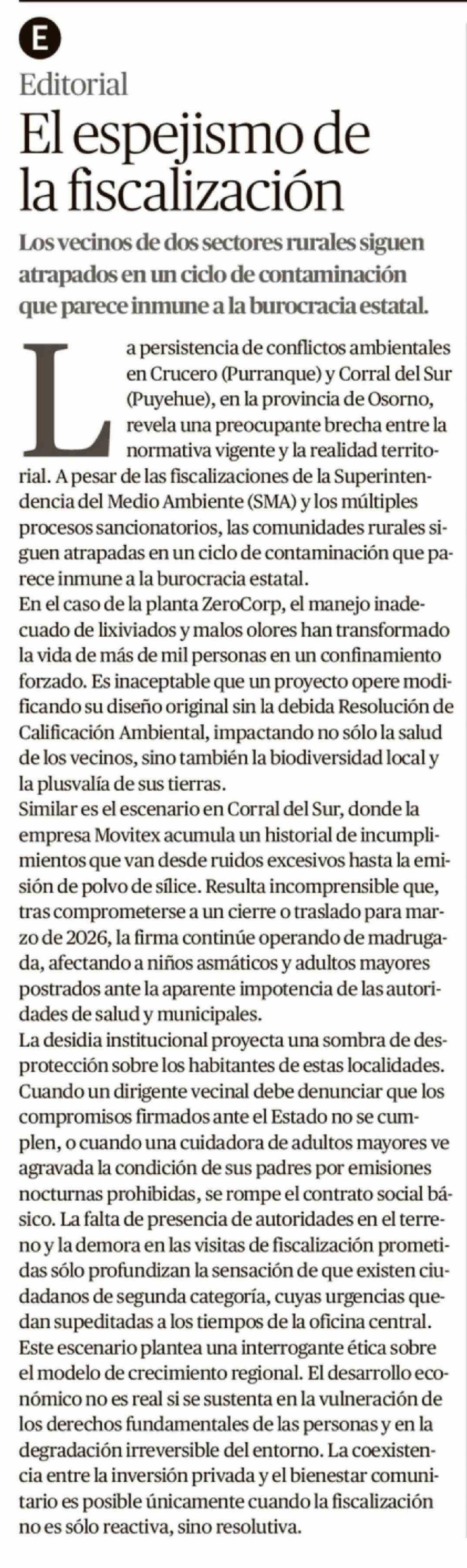 Editorial: El espejismo de la fiscalización 12-03-2026 El Austral de Osorno |