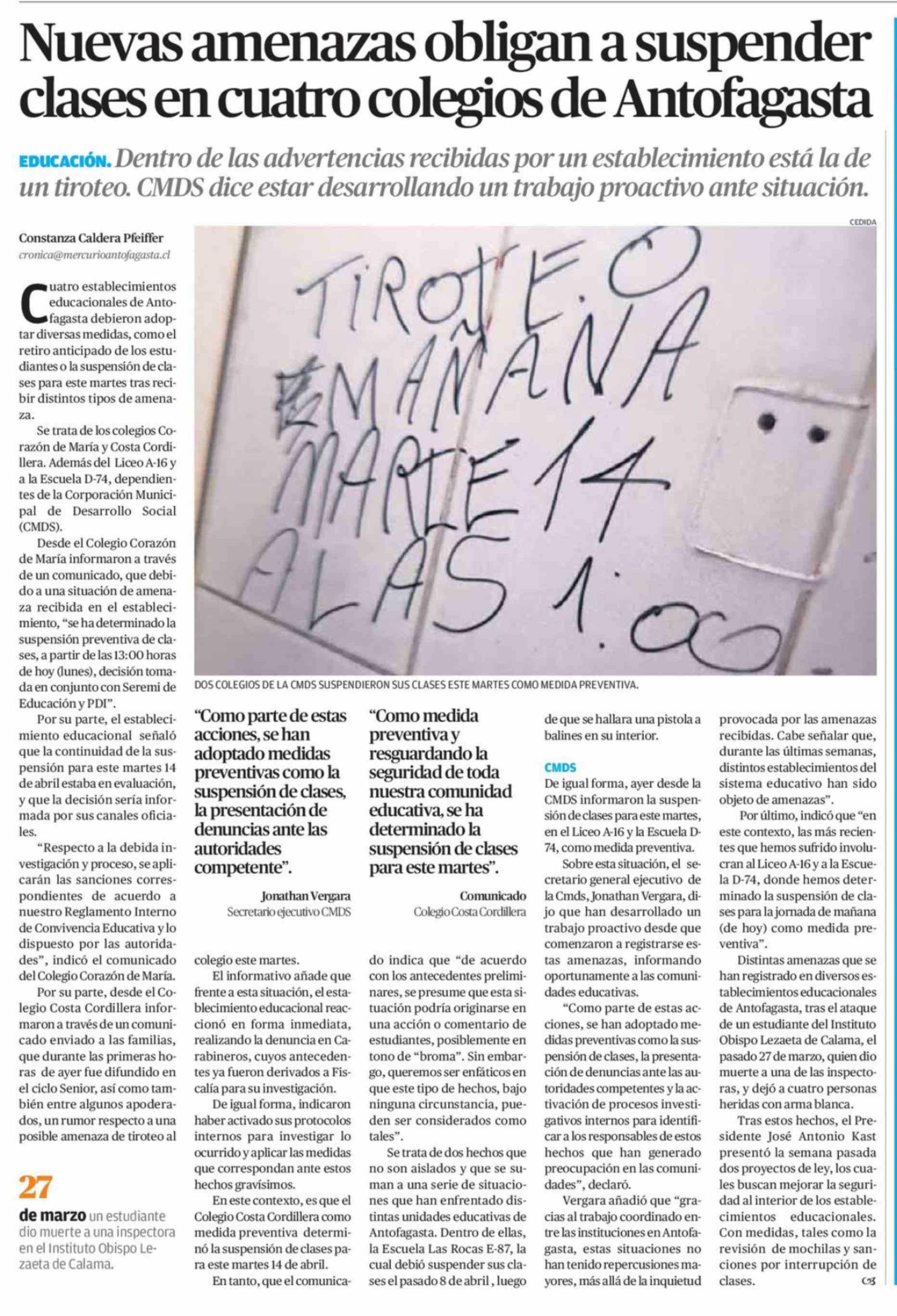 Nuevas amenazas obligan a suspender clases en cuatro colegios de Antofagasta 14-04-2026 El Mercurio de Calama |