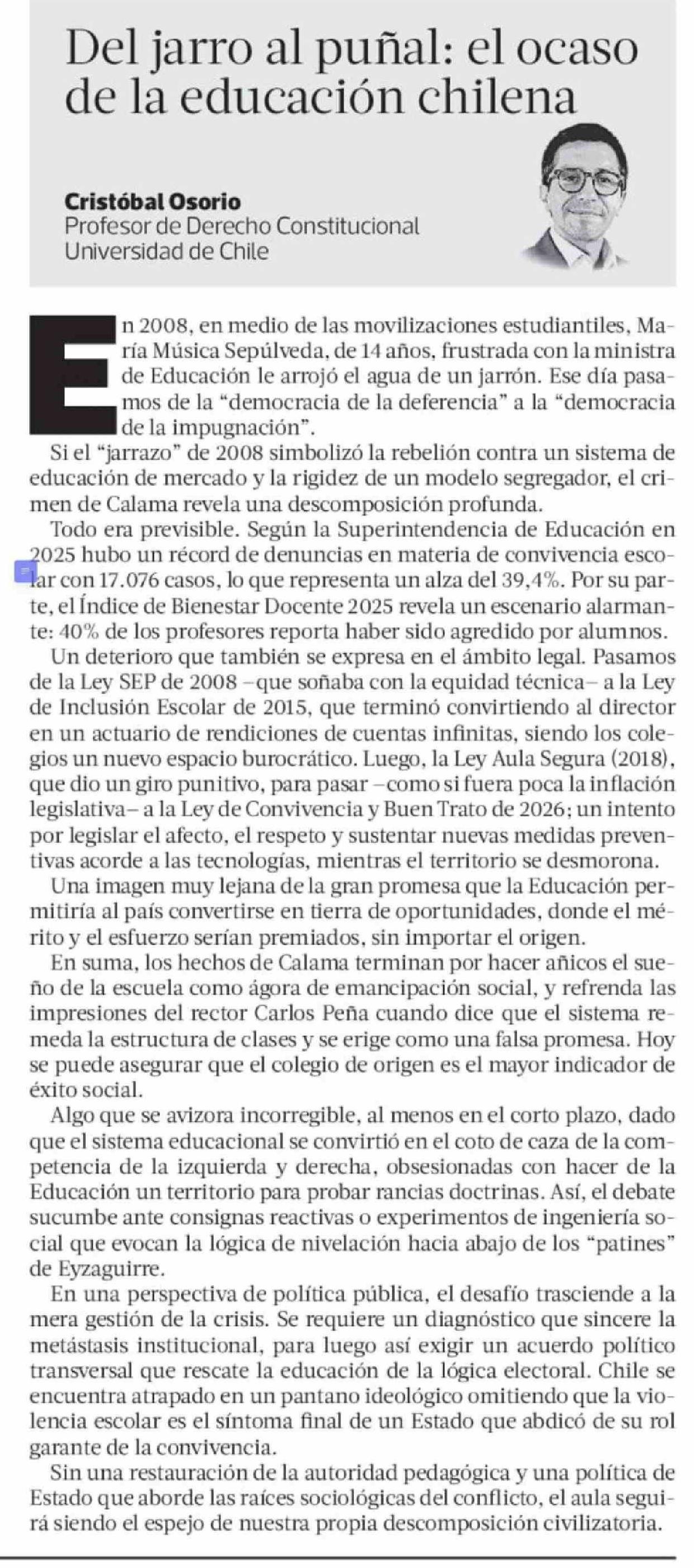 Columnas de Opinión: Del jarro al puñal: el ocaso de la educación chilena 02-04-2026 La Tercera |