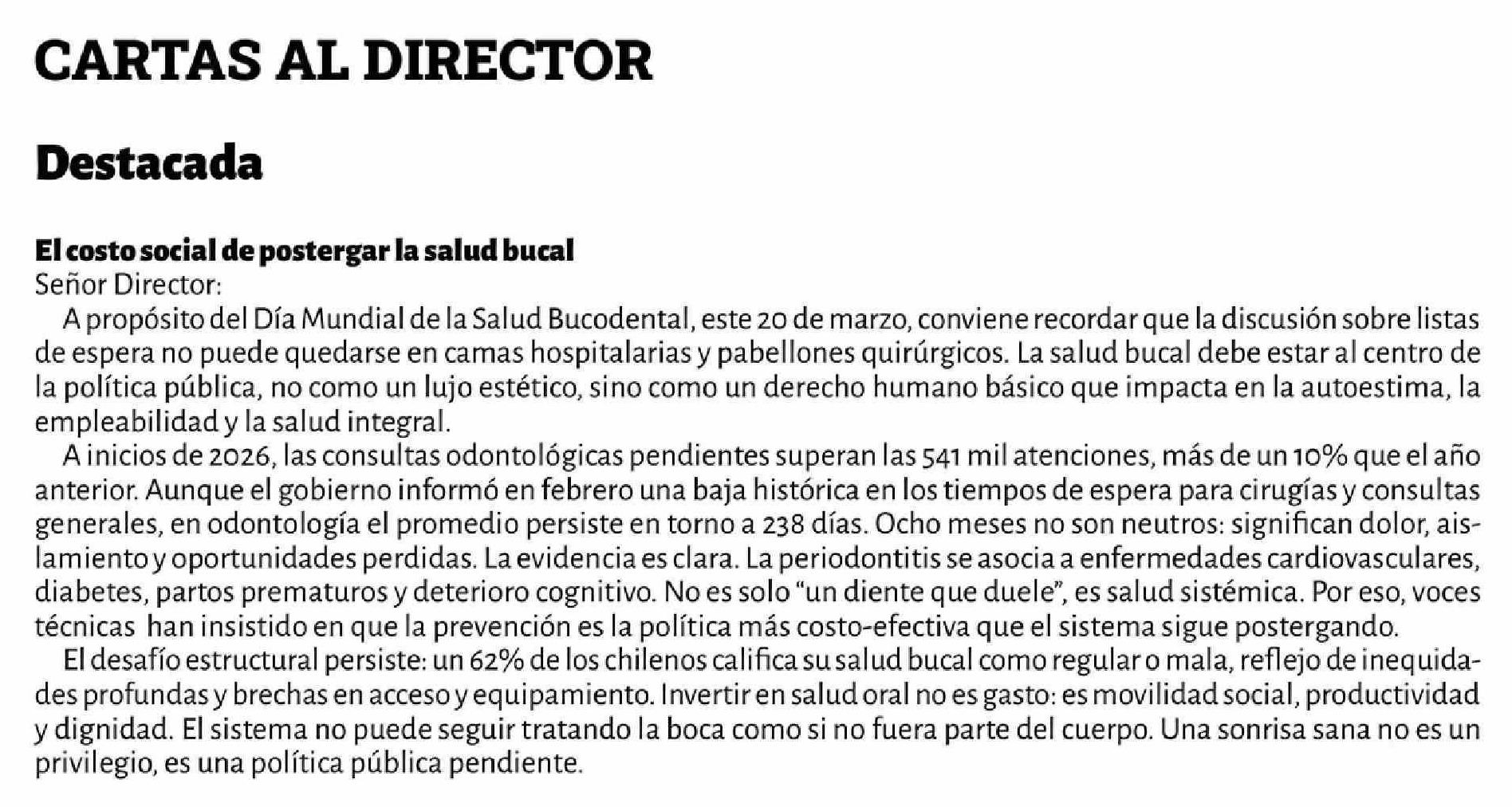 Título: Cartas: El costo social de postergar la salud bucal Señor Director: A propósito del Día Mundial de la Salud Bucodental, este 20 de marzo, conviene recordar que la discusión sobre listas de espera no puede quedarse en camas hospitalarias y pabellones quirúrgicos. La salud bucal debe estar al centro d