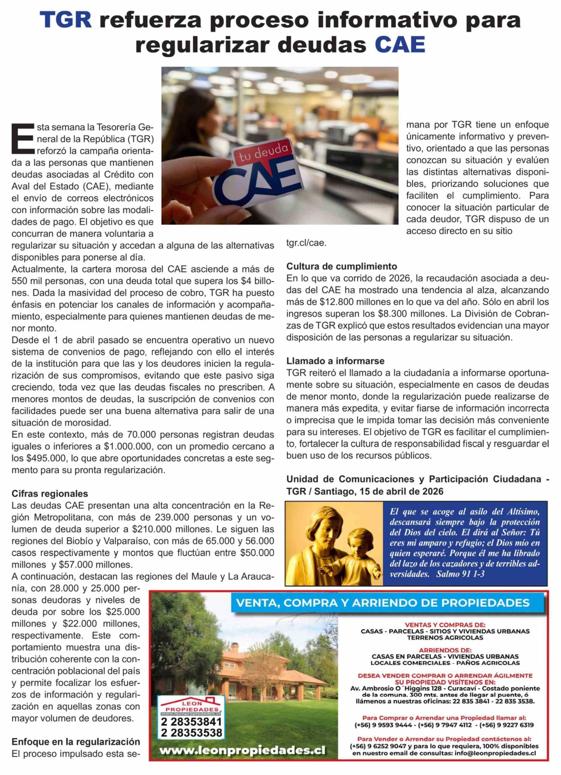 | Título: | TGR refuerza proceso informativo para regularizar deudas CAE |